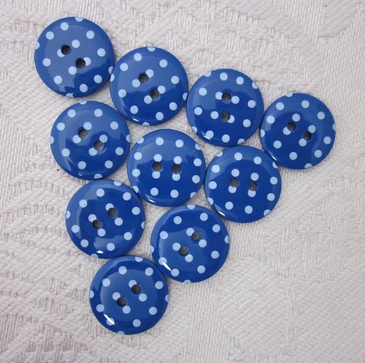 Glossy dark blue buttons polkadotted with white. Reverse is plain blue.