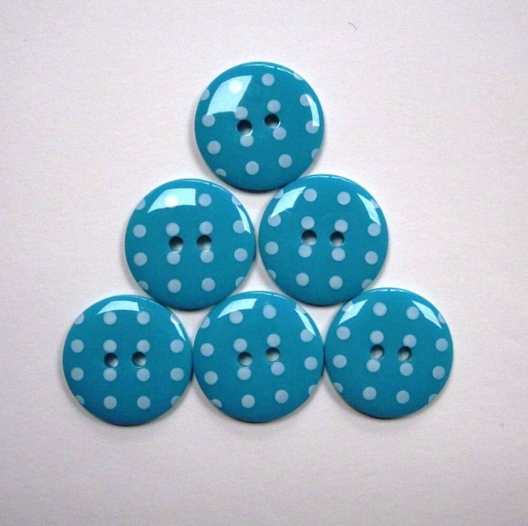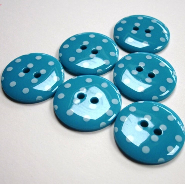Bright teal buttons polka dotted with white. Reverse is plain teal.