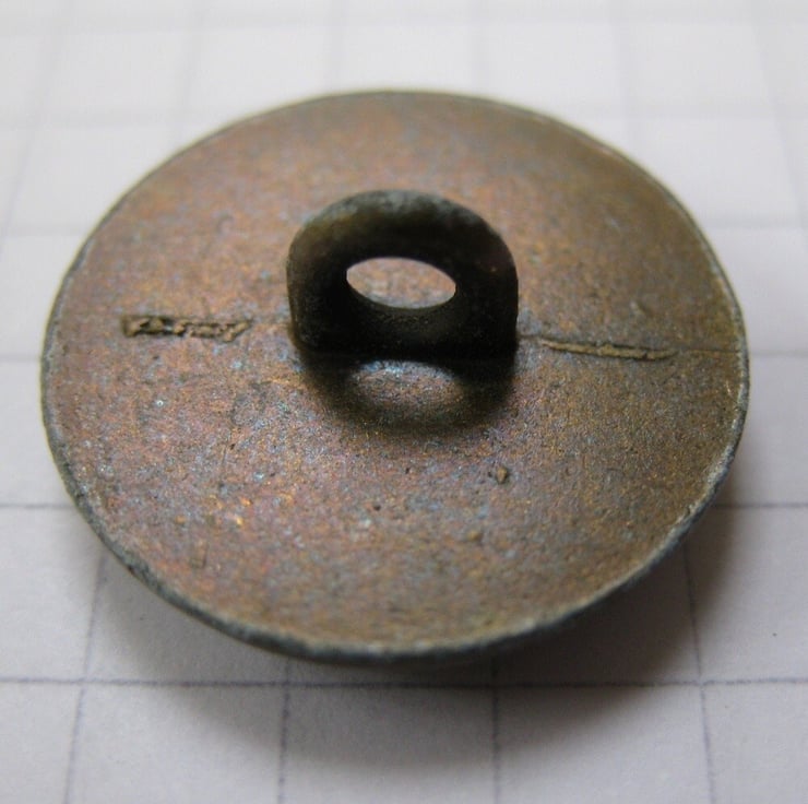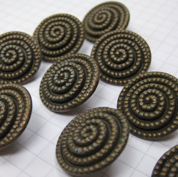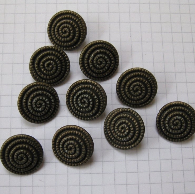 10 Copper coloured metal shank buttons with a spiral of raised dots on the front face.