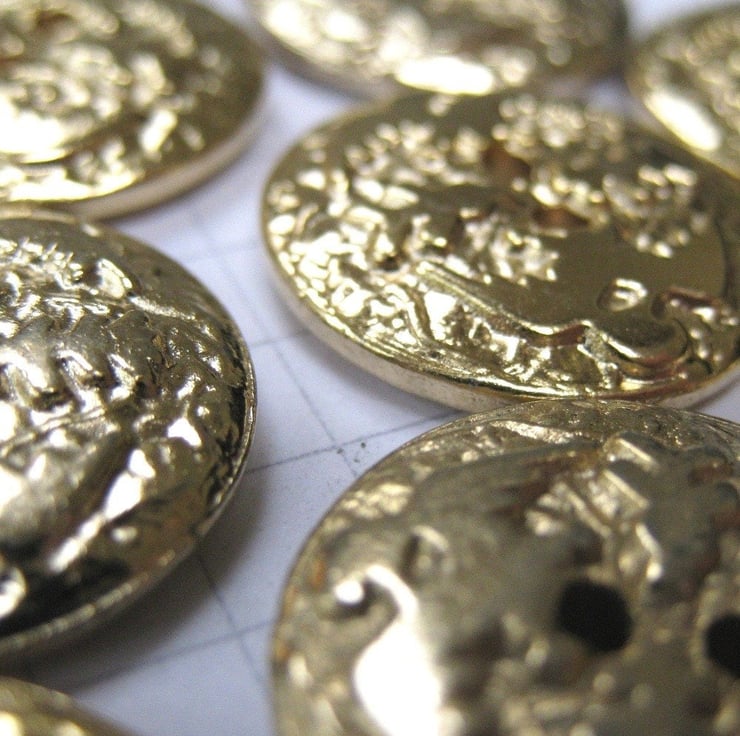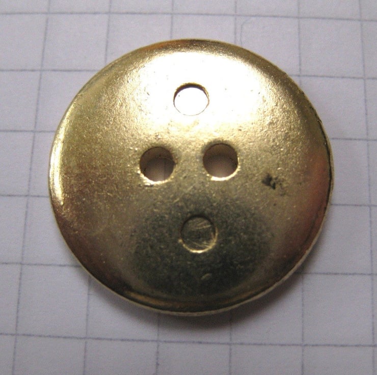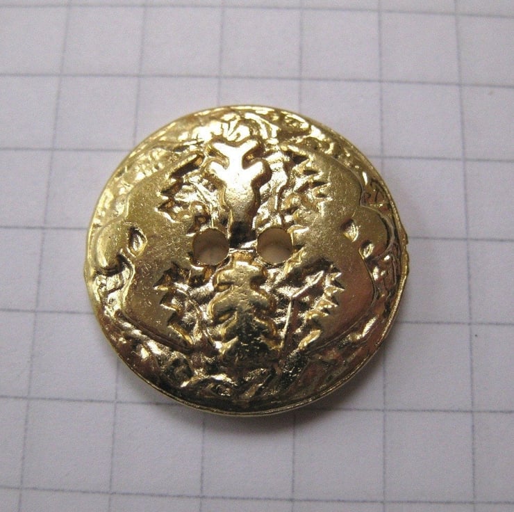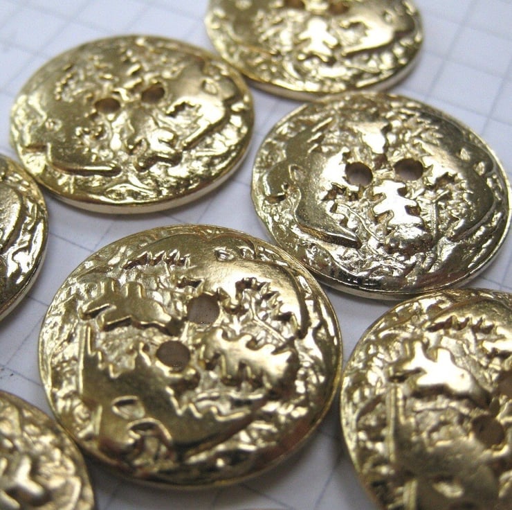 In the embossed surface of these flat shiny metal buttons are 2 birds with spread wings. Wonderfully textural and quite unusal.
