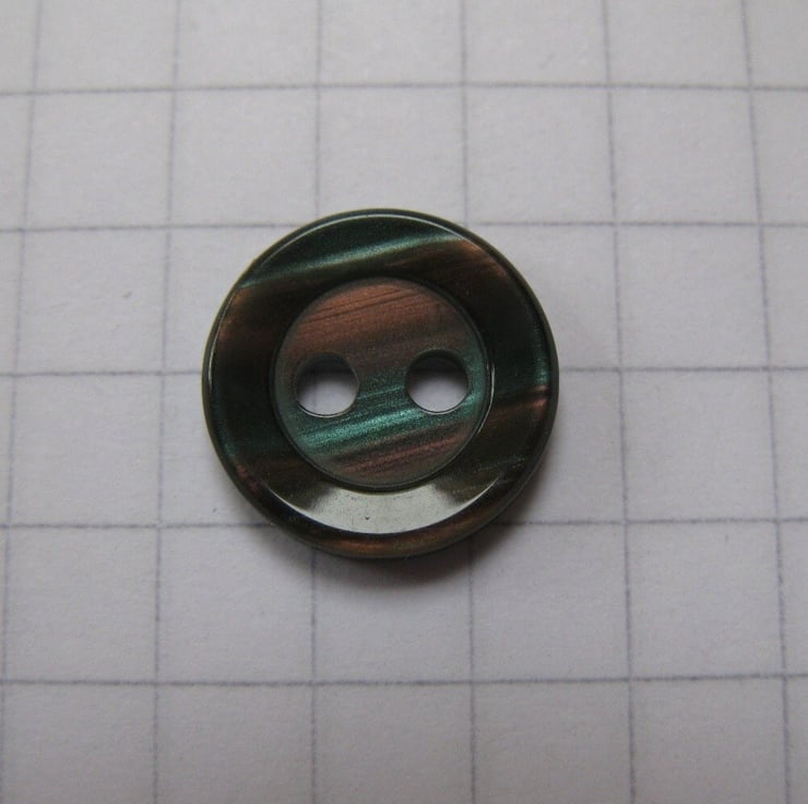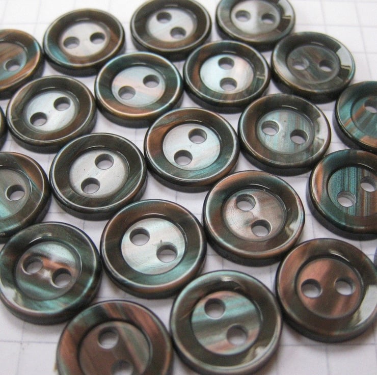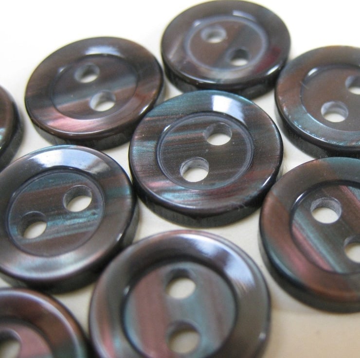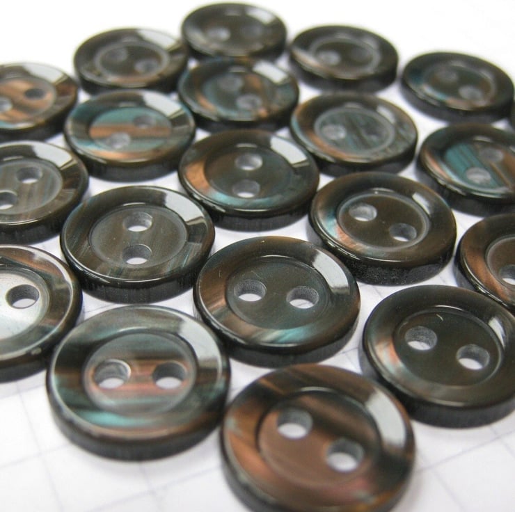 25 small dark plastic buttons. Not completely black, there is a slight iridescent sheen of purple and teal green in the right light.