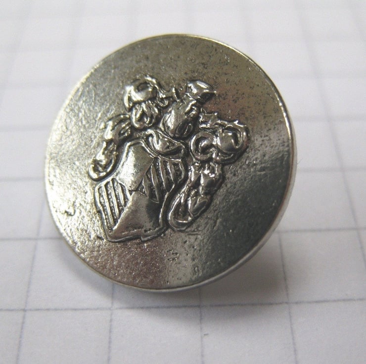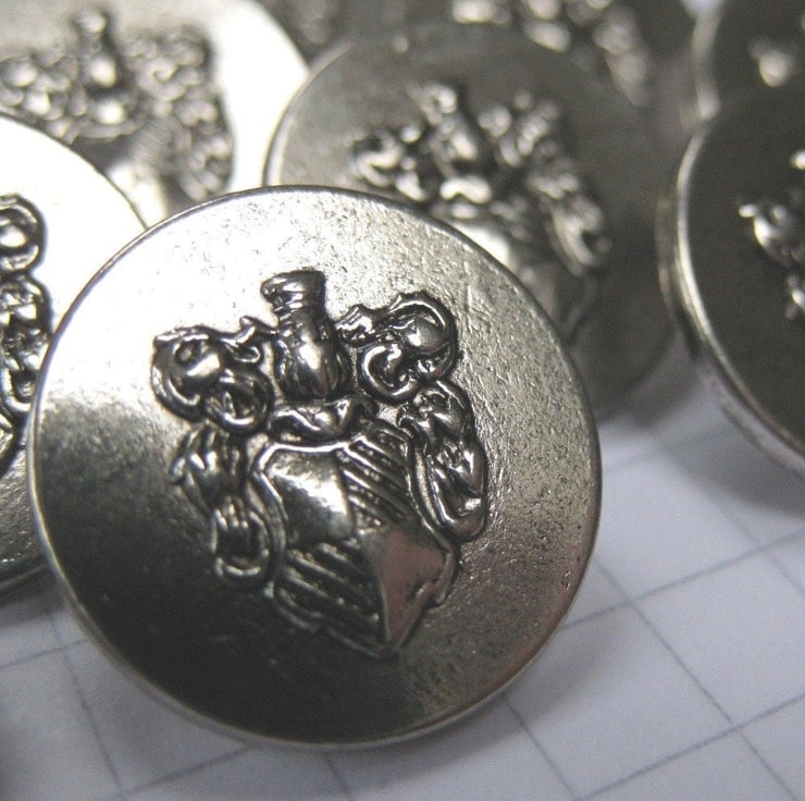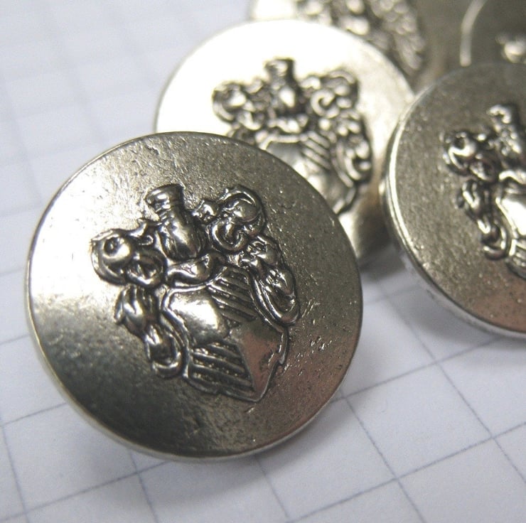 10 small silver metal shank buttons with a raised coat of arms or shield motif on the front face.