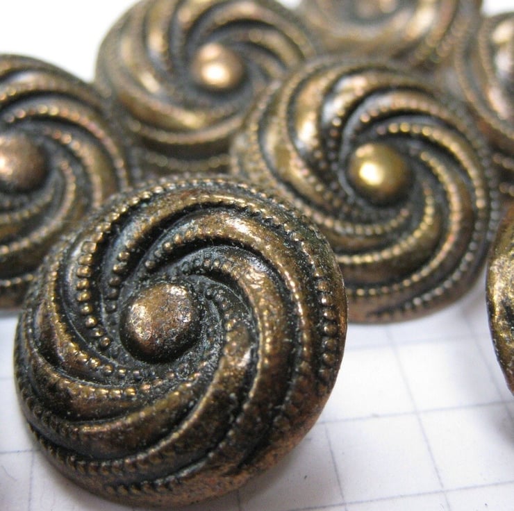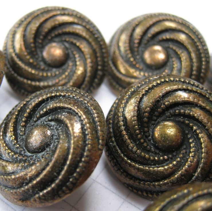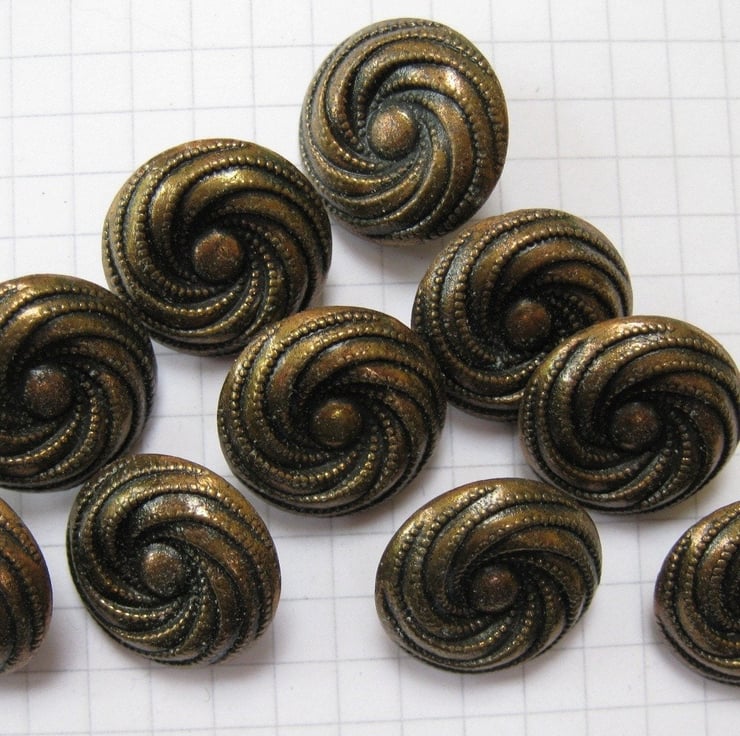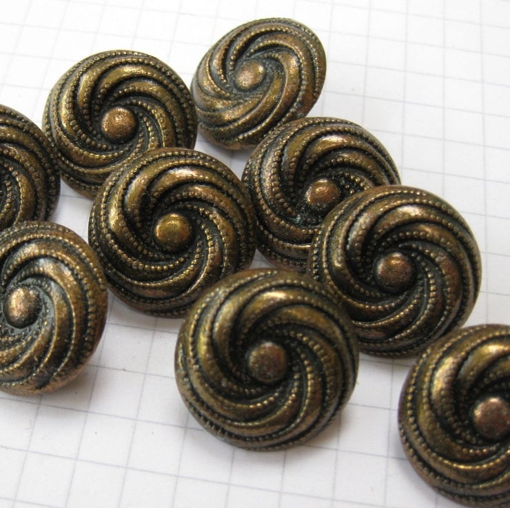 10 small copper metal swirl shank buttons.