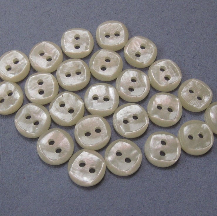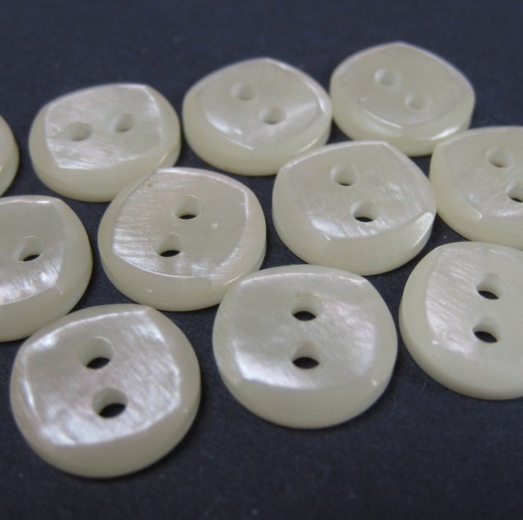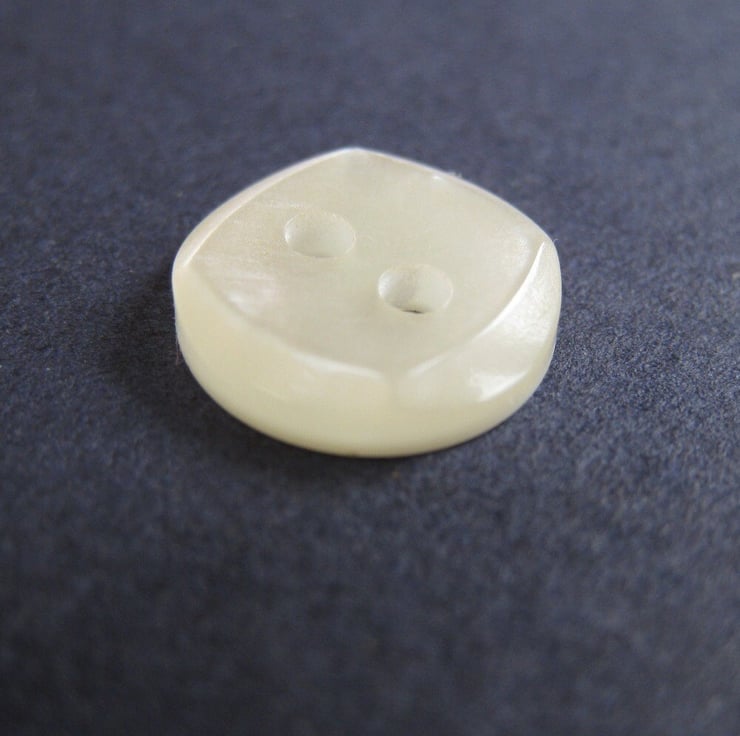 Small pearly ivory coloured plastic buttons with a moulded, squared-off upper face.