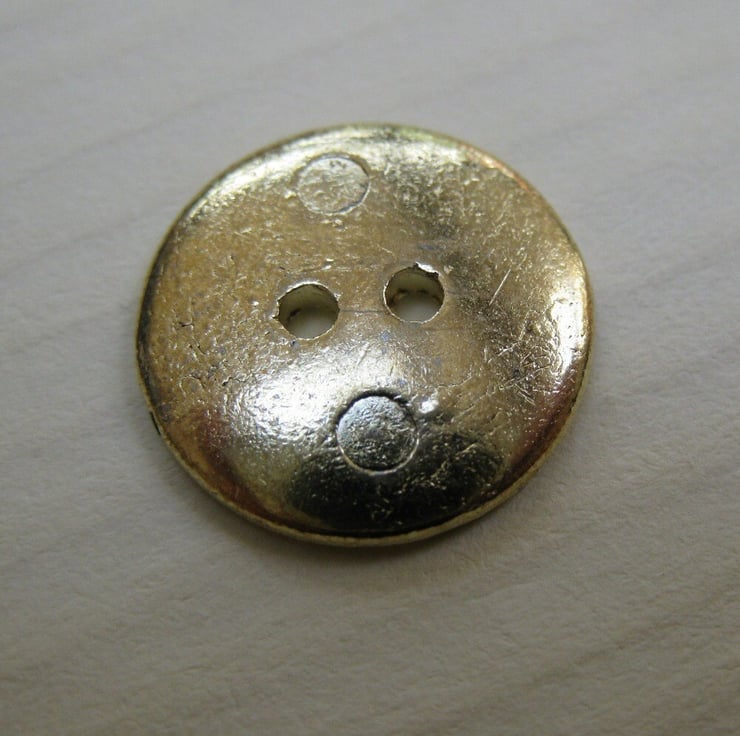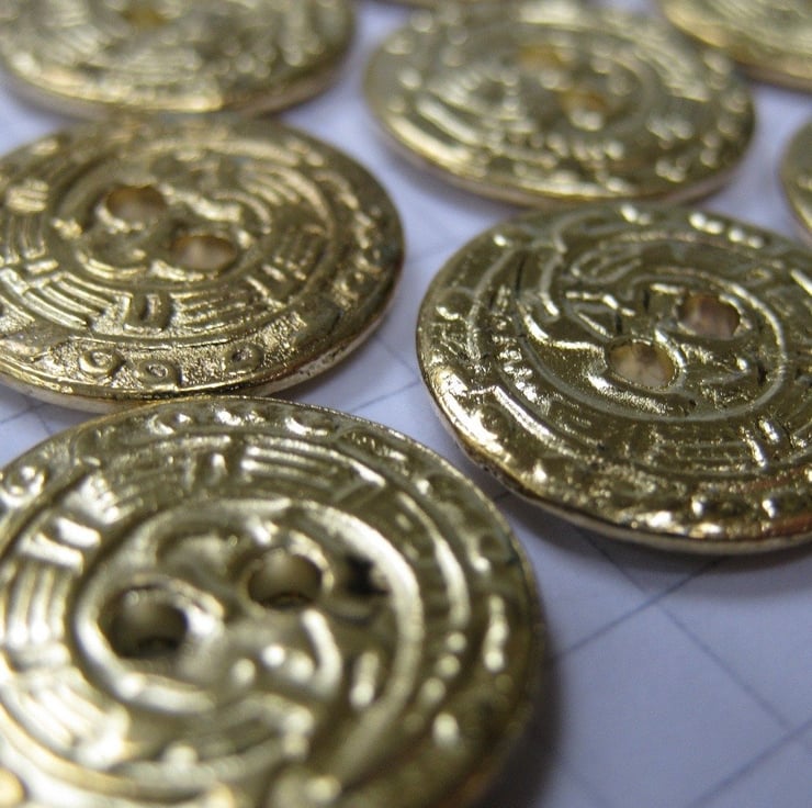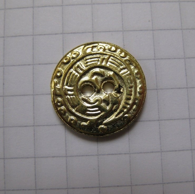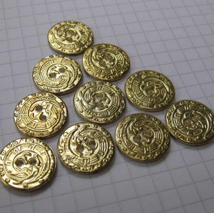 10 small brass flat buttons, with what seems to be a pattern of hieroglyphs on the front face. 1.5 cms (0.6") diameter.