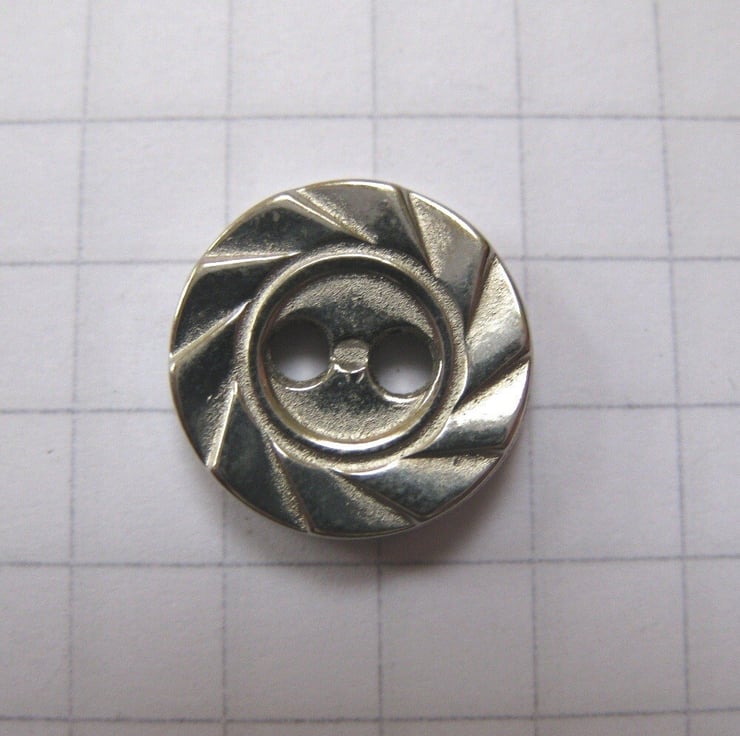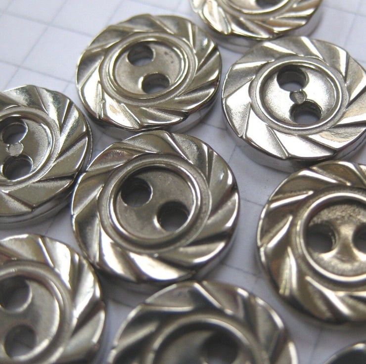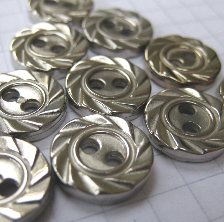 Tiny metallic silver acrylic buttons with 2 sewing holes. Moulded, textured rim. Reversible.