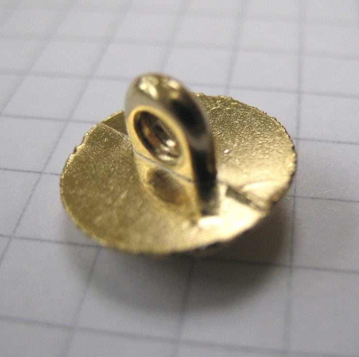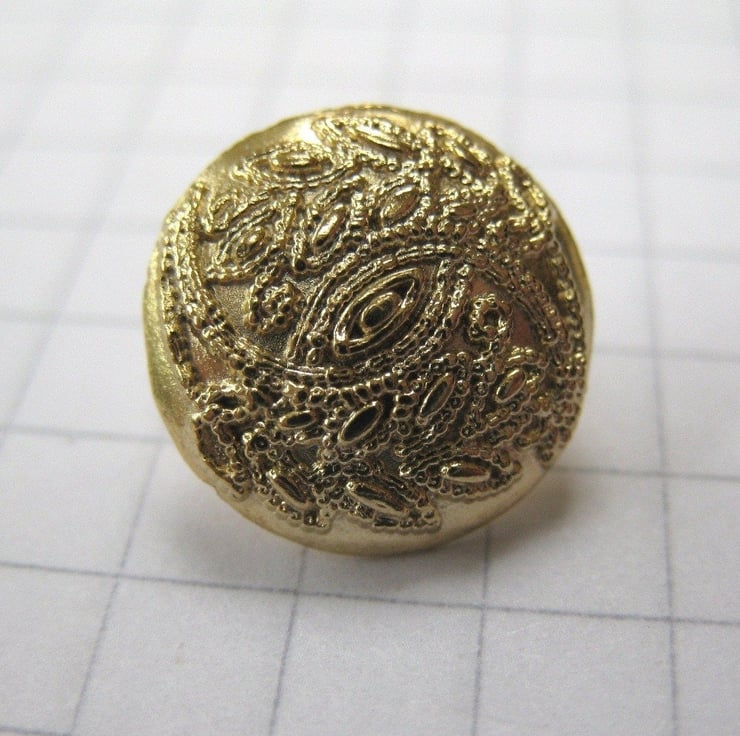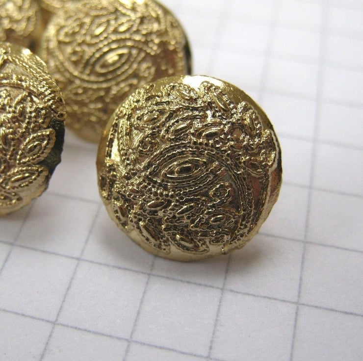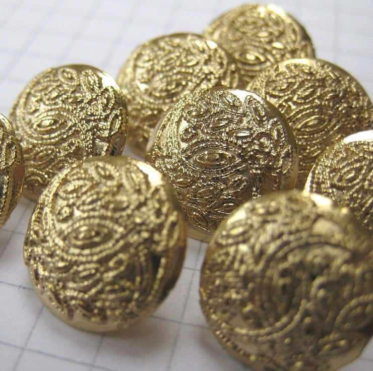 10 small brass coloured shank buttons with a delicate filigree pattern on front facing