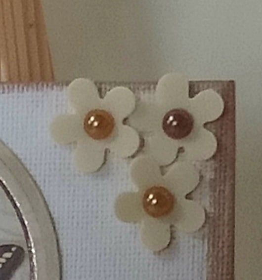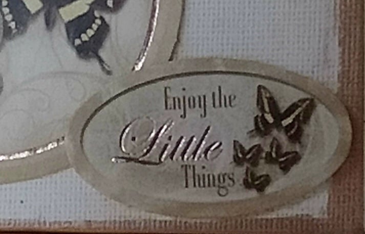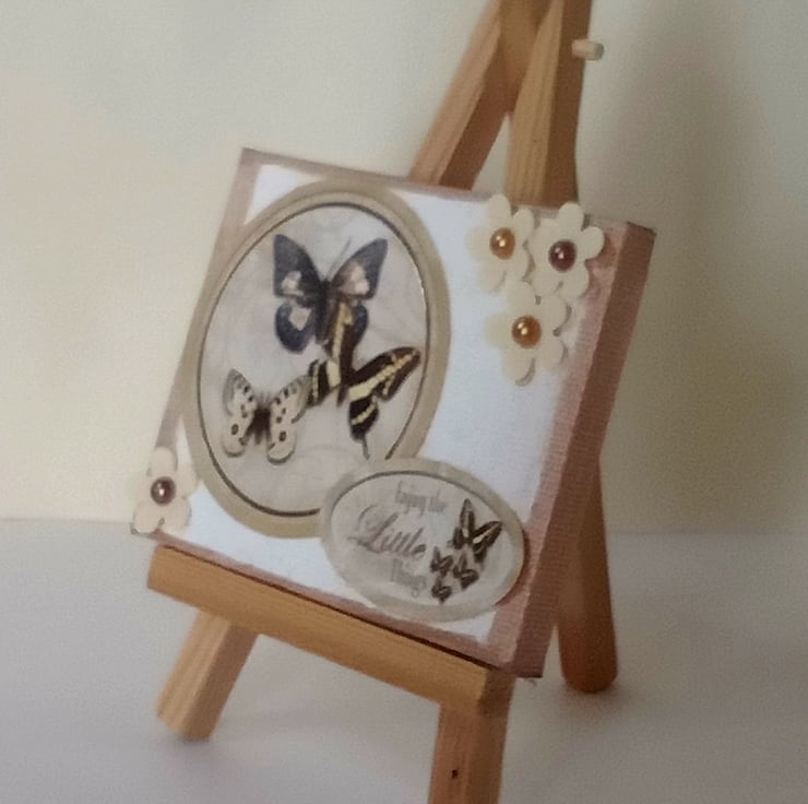 The canvas has been left it's natural colour but around the edges I've rubbed copper coloured ink. The 2 images on card feature butterflies and the smaller one has the words "Enjoy The Little Things" both have copper coloured foil highlights. I have made tiny flowers from thin craft foam placed them in the top right and bottom left corners and added faux pearls in sepia colours to their centres.