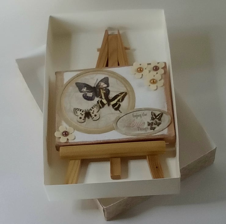 This item can be a card and gift all in one. It comes with the easel, a handmade gift box and piece of blank card ready for you to write a message on and attach to the back of the canvas. It also makes a pretty piece of home decor to keep for yourself.