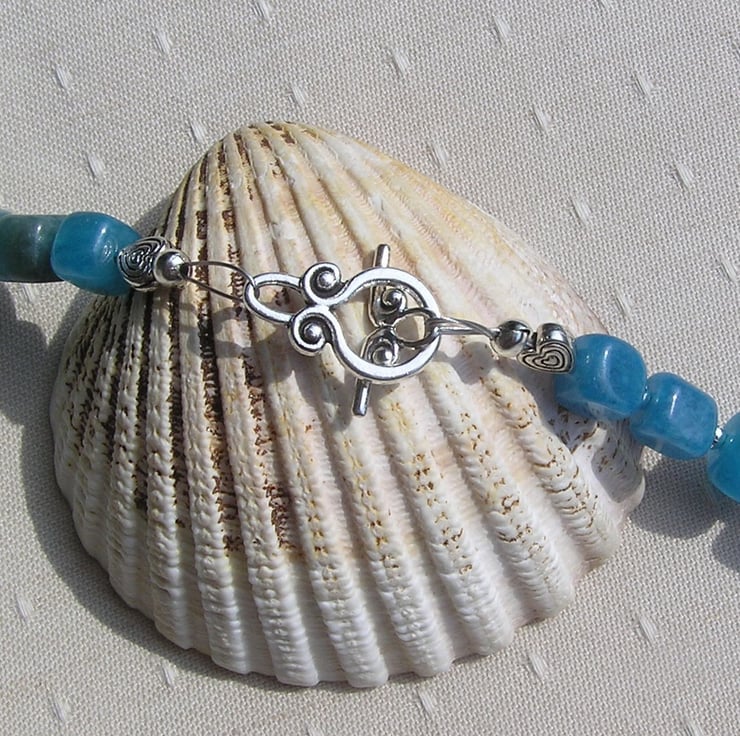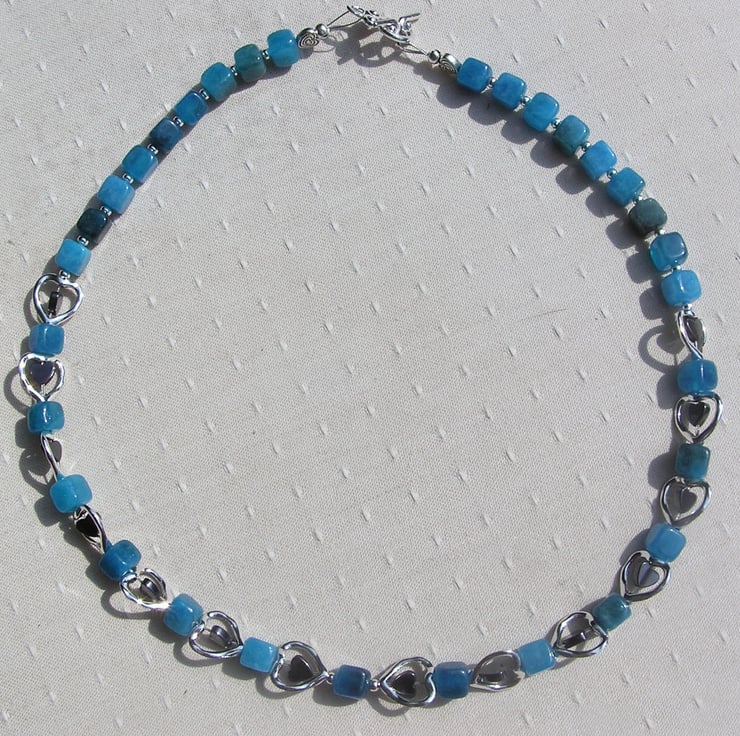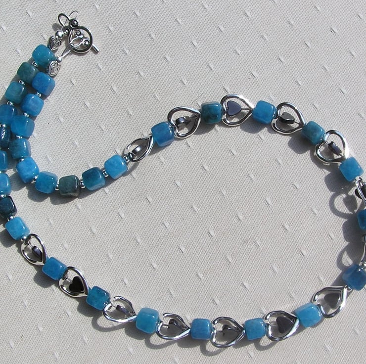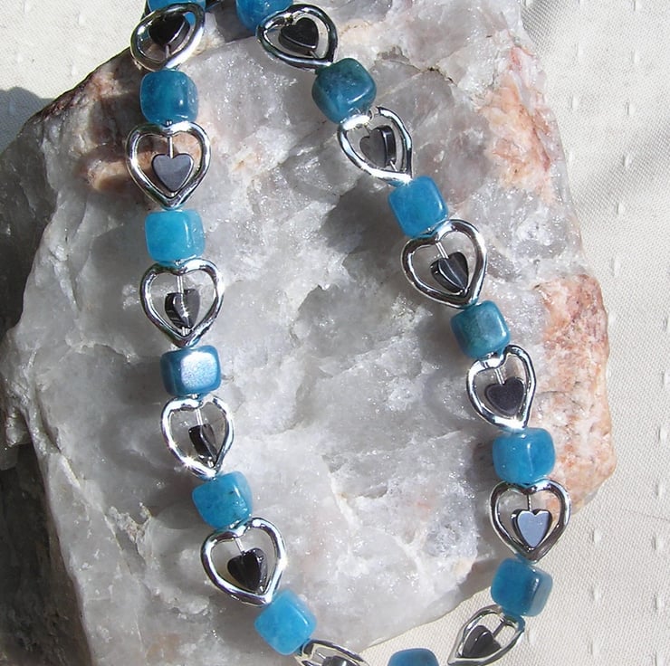 The Central swathe of this Stunning Necklace is made from alternating Teal Apatite square beads and Black Hematite Heart shaped beads… which are floating/suspended inside Tibetan Silver Heart Frames – this then flows more of the Teal Apatite beads this time alternated with a tiny silver spacer bead with a Tibetan Silver Heart at each end… A Celebration of Teal & Black that will look stunning for either the casual look or wear it with something more Elegant for a Special Evening out