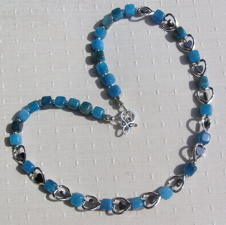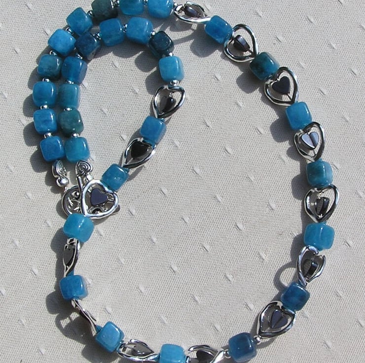 Teal Apatite & Black Hematite Crystal Gemstone Heart Necklace