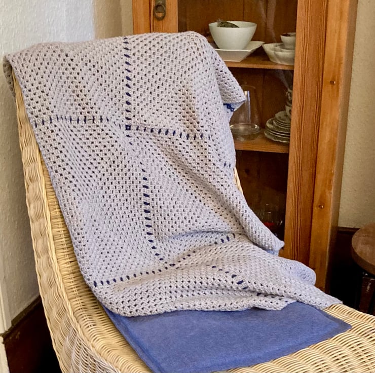 Made from giant granny squares, this blanket has a lovely drape and is incredibly soft thanks to the silk/cotton yarn. It measures about 45 by 60 inches (110 by 150 cm2), perfect for the sofa and looks great when folded up too!