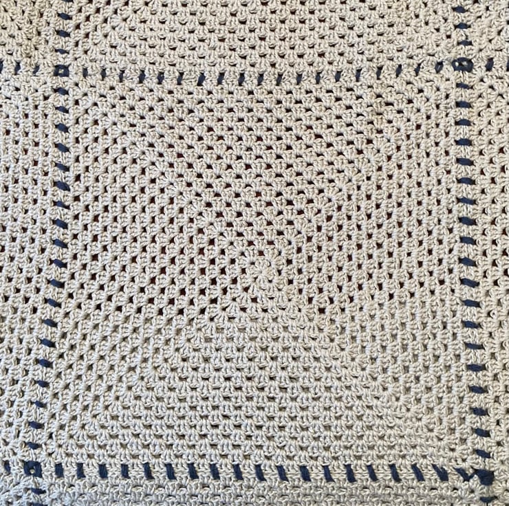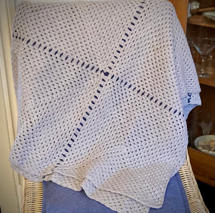 I made this blanket because I wanted to experiment with large granny squares, and how to put them together in a novel way. Rather than crocheting them together! I used navy yarn to sew the squares together with large stitches. I like simple, cleaner lines and the overall elegant look. The blanket is soft and heavy and feels wonderful.