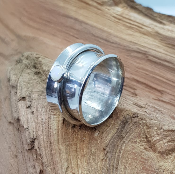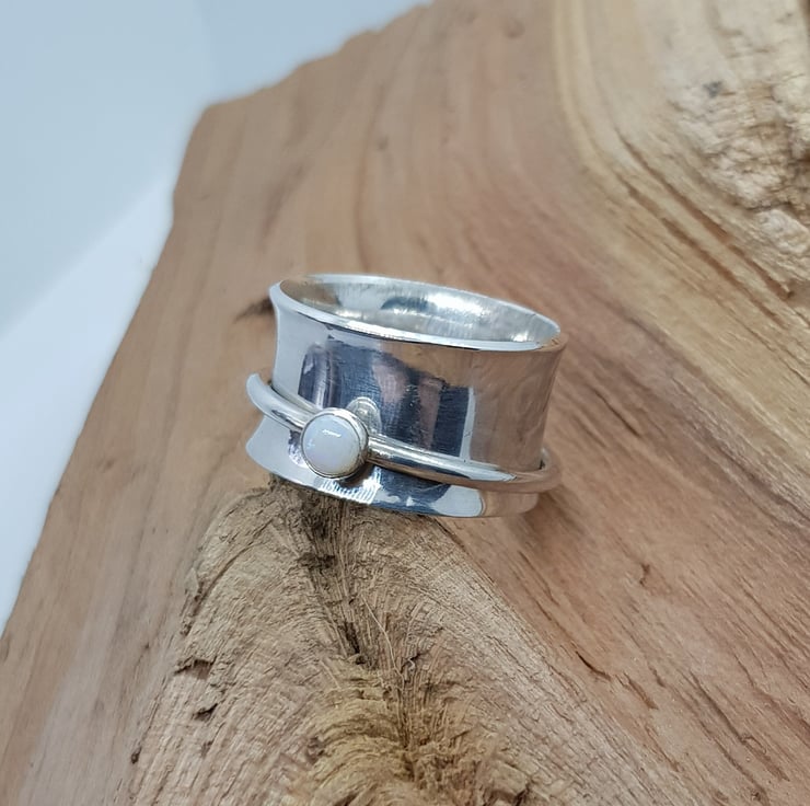 Opal spinner ring. A simple cabochon set opal band encompasses a larger band of sterling silver ready top spin and fidget with as you please.