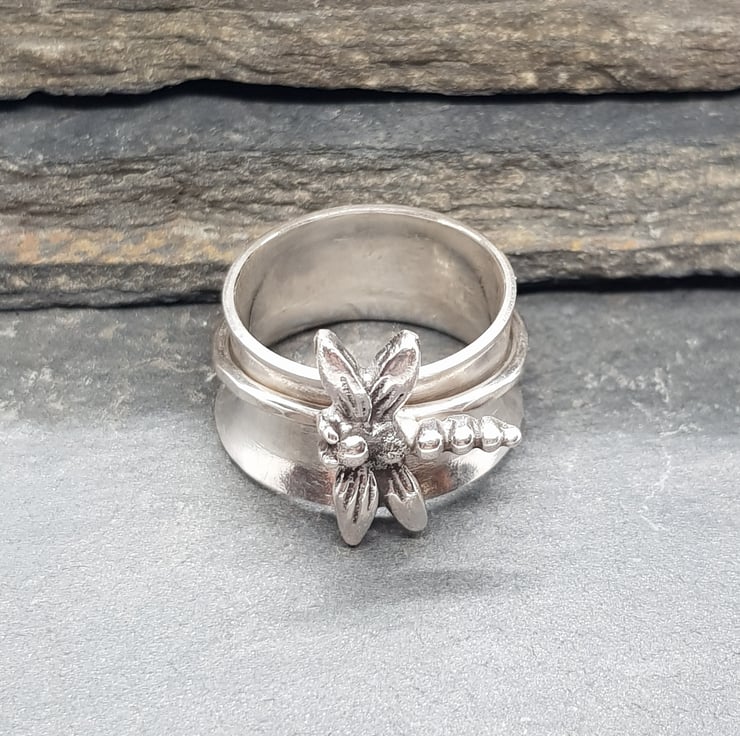 Solid silver dragonfly spinner ring.