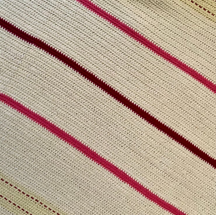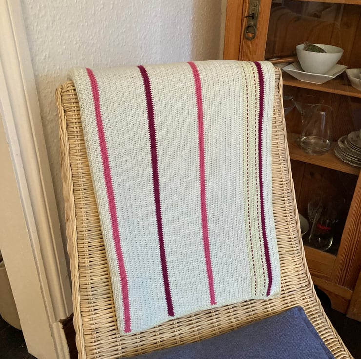 I wanted to make a spring blanket, and selected the tones and yarn accordingly. The look is clean and simple with burgundy stitching adding a more playful note.