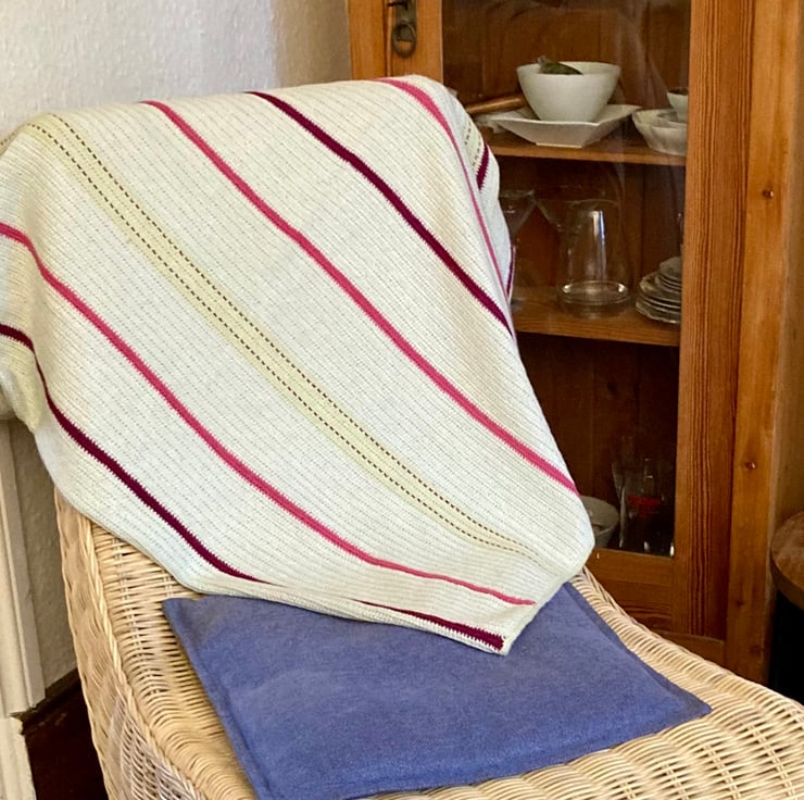 Striped cotton blanket, measuring about 40 by 65 inches (100 by 165 cm2). The soft green and pink tones and the pure cotton yarn make it perfect for spring when a wool blanket is too warm.