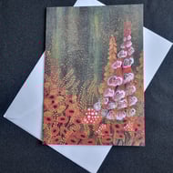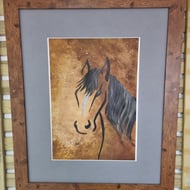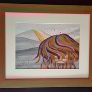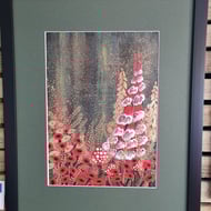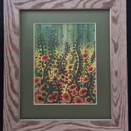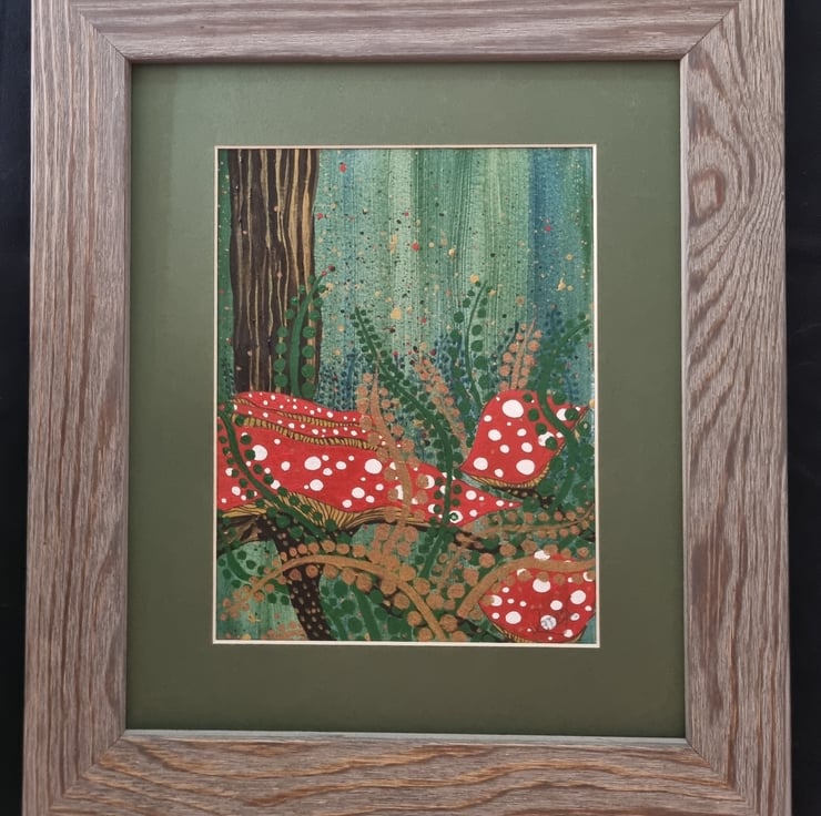 An original piece in acrylic depicting mushrooms (toadstools) growing from the side of a tree. The piece is mounted on dark green mountboard and framed with a wood effect frame. The overall size is 38cm (h) x 33cm (w).