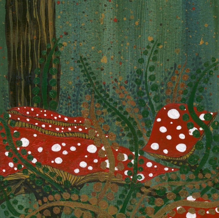 I was inspired by a local tree that had an enormous mushroom growing from the side. Painting it in a similar style to other artwork and using metallic acrylic paint to add some fantasy to the picture.