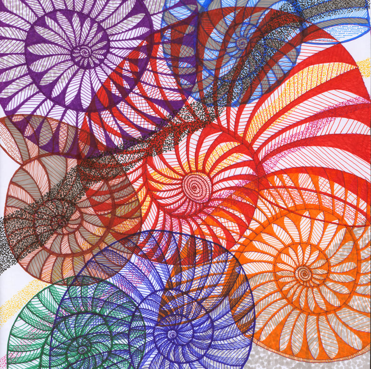 Inspiration was gleaned from a wonderful tutor who was obsessed with ammonites and in particular their structure both internally and externally. Unfortunately the tutor has passed away and this is my tribute to her.