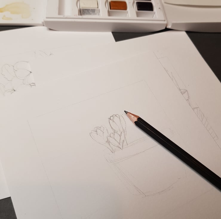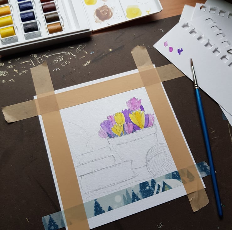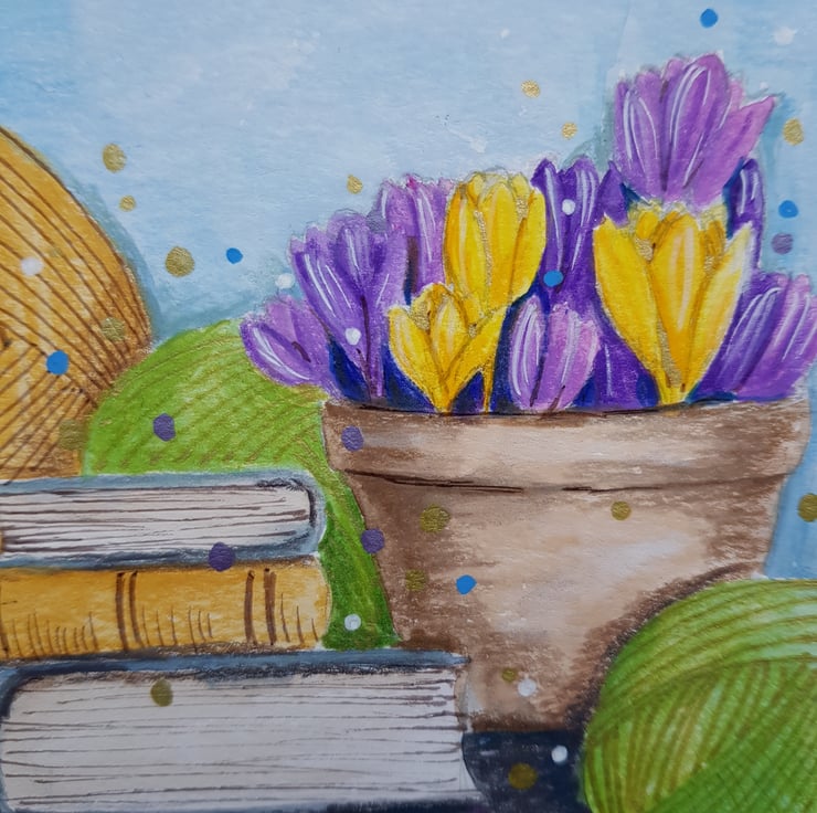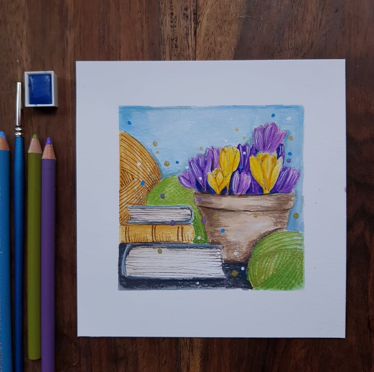 Small original artwork inspired by the colourful hope brought to our early spring garden by crocuses. I used watercolours, coloured pencils and acrylics to create this artwork.