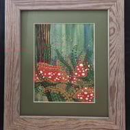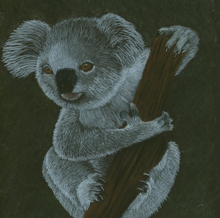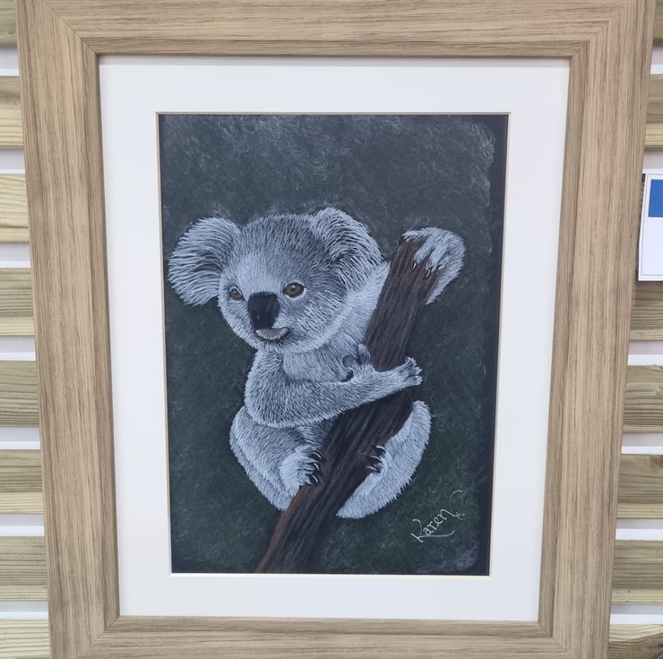 An original drawing in pencil of a Koala perched on a tree stump. the piece is mounted on cream card with a light wood effect frame. The overall size is 43cm (h) x 36cm (w).