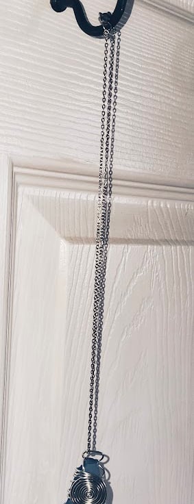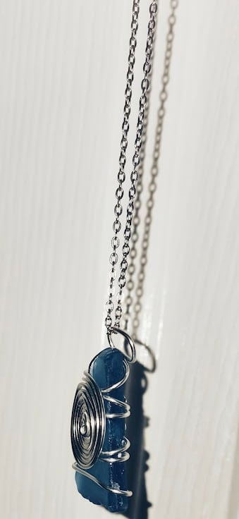Handmade Wire Wrapped Frosted Blue Glass Pendant – Silver Wire Spiral on Chain