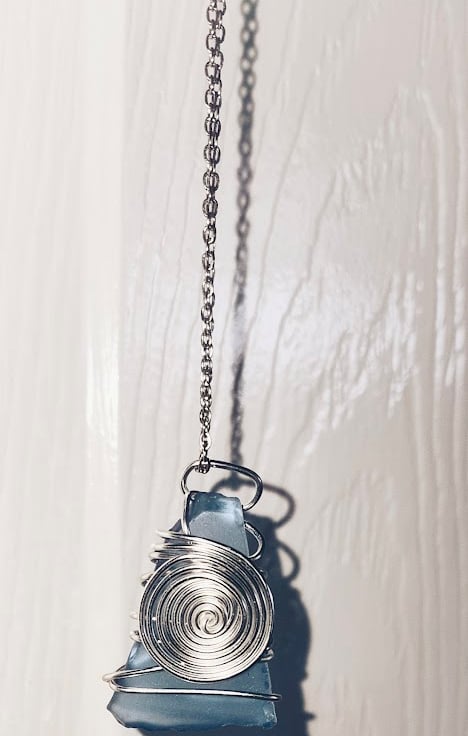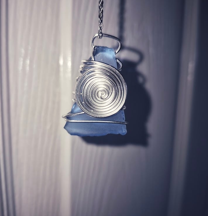 This handmade pendant features a piece of frosted blue glass, carefully wrapped by hand in silver-tone wire with a decorative spiral detail. The softly textured surface of the glass gives it a muted, matte finish, while the wirework adds structure and visual interest.