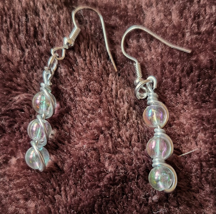 These handmade drop earrings feature clear glass beads wrapped in silver-tone wire, creating a simple, elegant design with subtle movement. The transparent beads gently catch the light, giving the earrings a clean, understated sparkle.