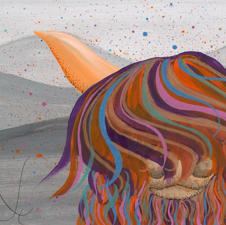 An A5 printed reproduction of an original acrylic painting of a stylised Highland Koo.