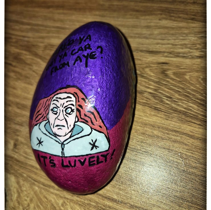 This one-of-a-kind stone has been hand painted with a character illustration and a classic British humour–inspired quote. Painted in bold colours with fine black detailing, the design captures a nostalgic, tongue-in-cheek moment that will instantly raise a smile.