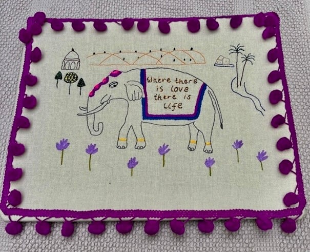 This elephant, with his wise words of life and love has been hand embroidered onto linen. The words are a famous quote of peace loving Mahatma Gandhi. The piece is mounted onto foam board and framed by a stunning purple, bobbly pom pom trim, giving the piece an Indian authenticity. There is a pretty Indian multi coloured tape attached to the back of the piece to hang up the picture with. It is backed with a strong beige material. The whole piece measures 11" x 14" and is ready to hang on your wall. This would be a lovely gift to give someone on Valentine's Day or just as a wonderful statement of love and life.
