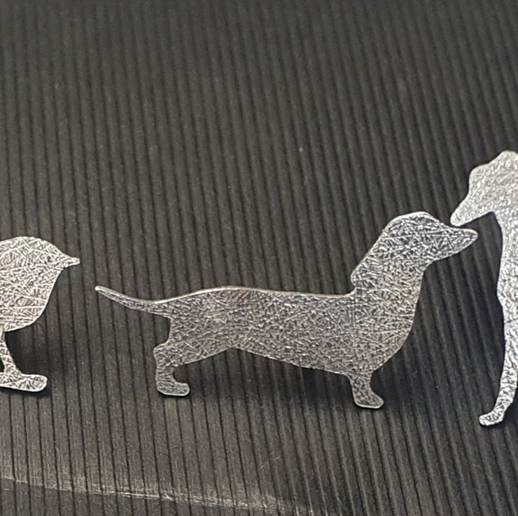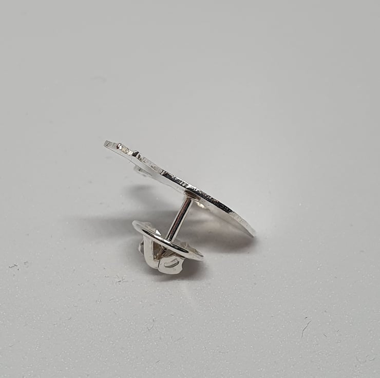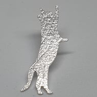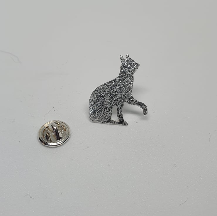 Handcrafted in a small Sheffield studio, this sterling silver brooch or tie pin features a hand-pierced cat, patiently waiting to be stroked. The piece is delicately textured to create a subtle, varied finish. The cat measures 2.2 cm in height and 2.0 cm in width and is secured with a sterling silver butterfly catch. The pin is 1cm long.