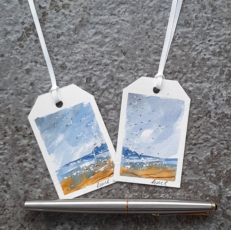 Complete your gift with some handpainted tags of gulls and the ocean. Watercolour