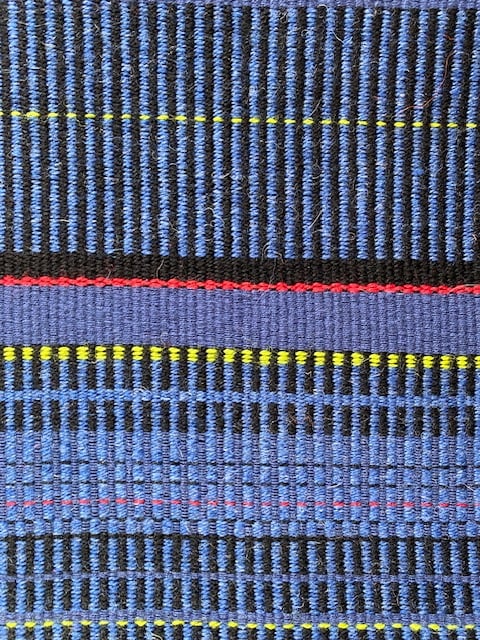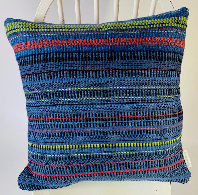 Hand woven 100% wool cushion in colbalt blues,lime green, cherry red stripes