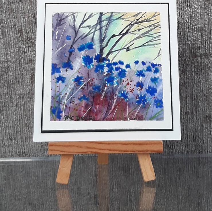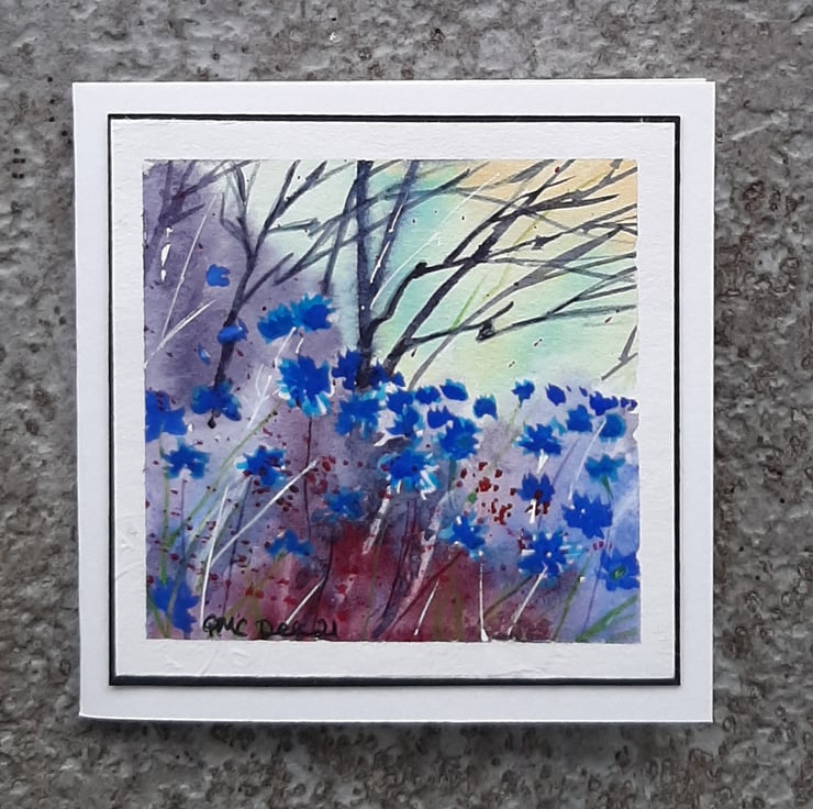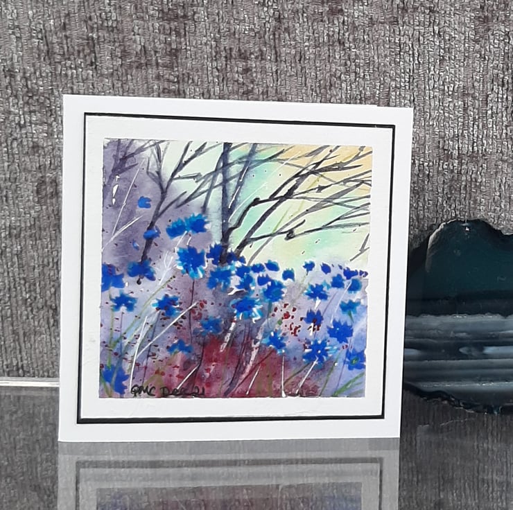 A beautiful watercolour painting of bright blue cornflowers made into a card, and ideal to send as a gift for framing. There's plenty of space for you to write your message inside.