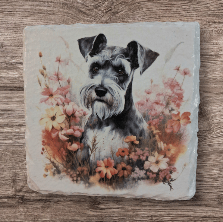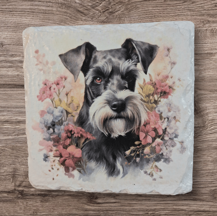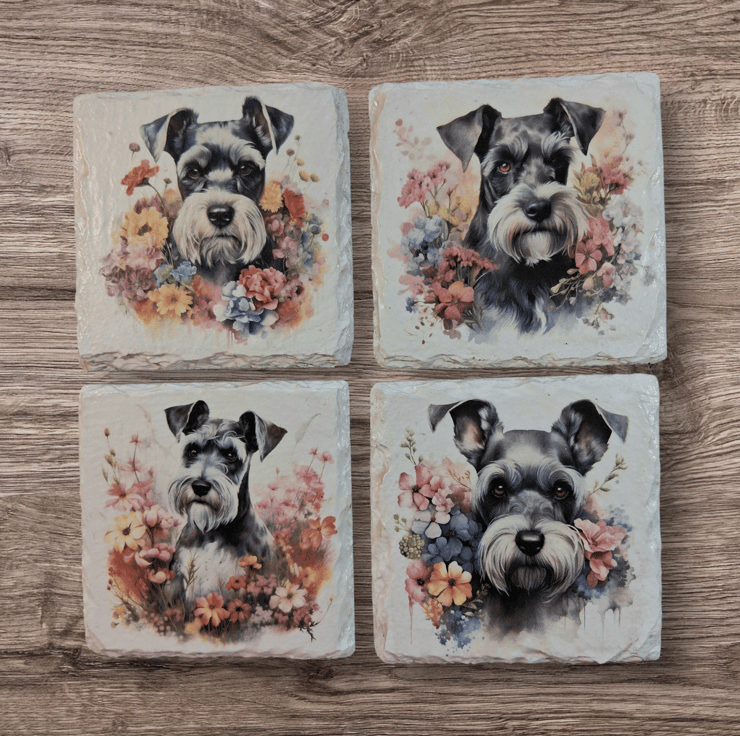 This 4 piece slate coaster set has been hand painted and decoupaged with a beautiful Schnauzer Dog.