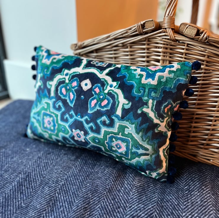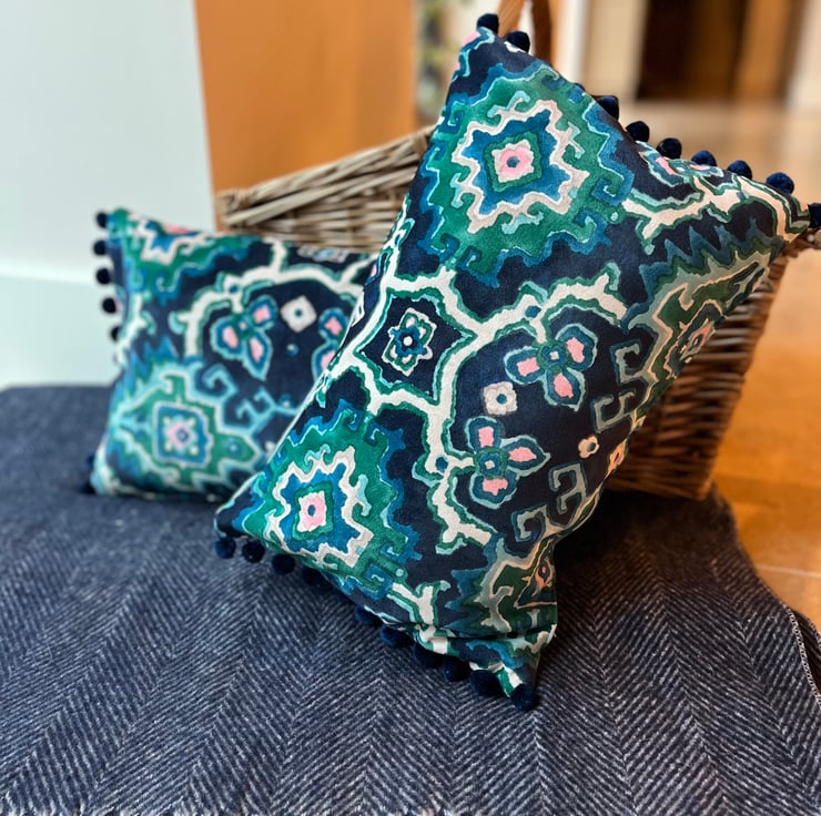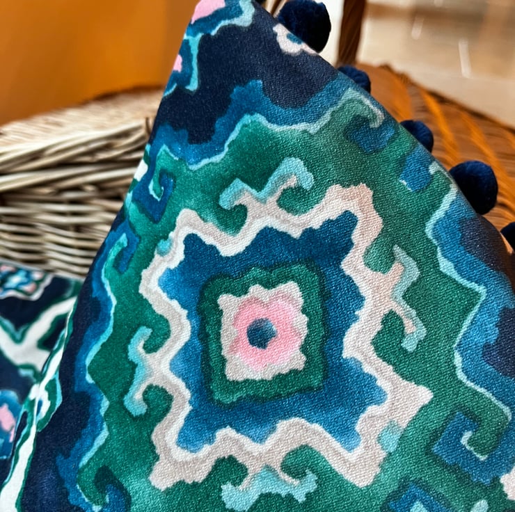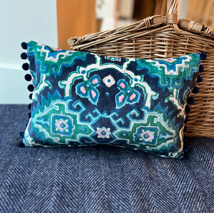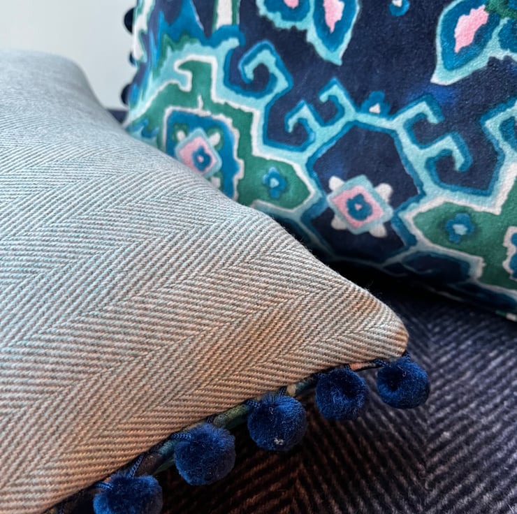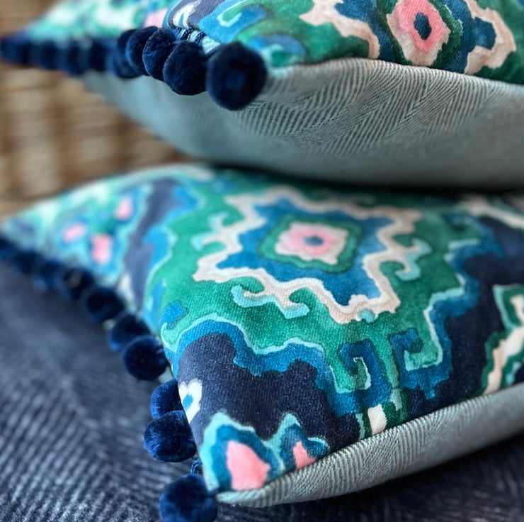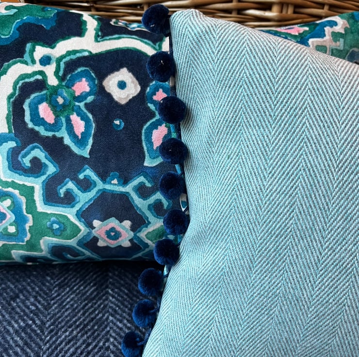 Beautiful velvet cushion cover made from linwood Kami in sea green colourway. I have backed the cover with pale blue-grey herringbone fabric and trimmed the ends with velvety navy pompoms. This cushion gives a lovely pop of colour.