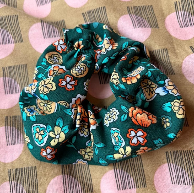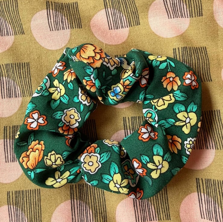 Green floral soft cotton scrunchie. This scrunchie is part of an effort to be more sustainable. All of the scrunchies are made from left over material from previous collections.