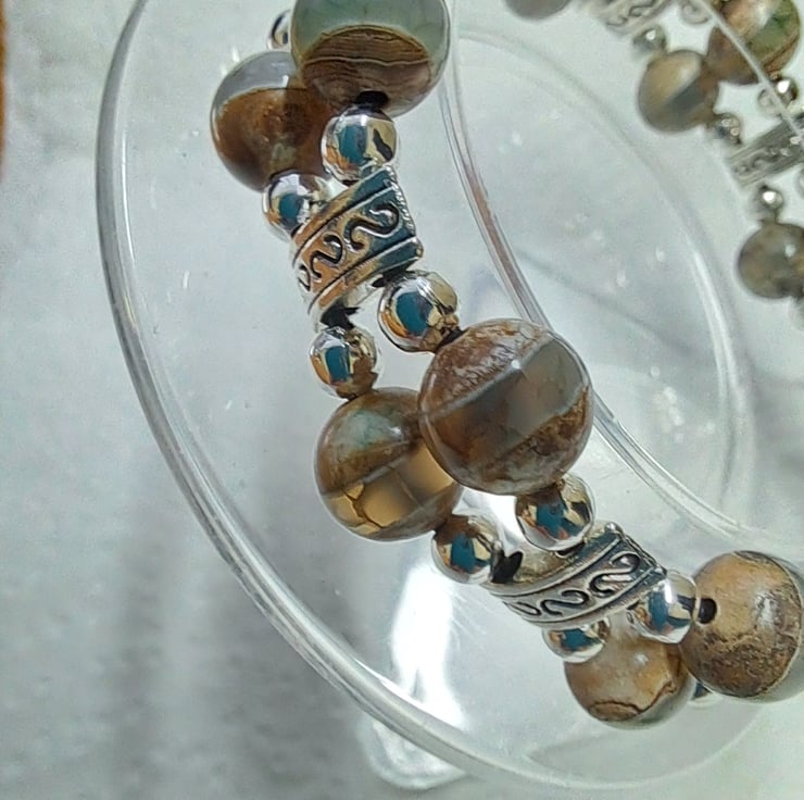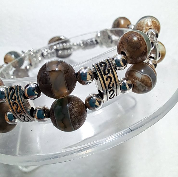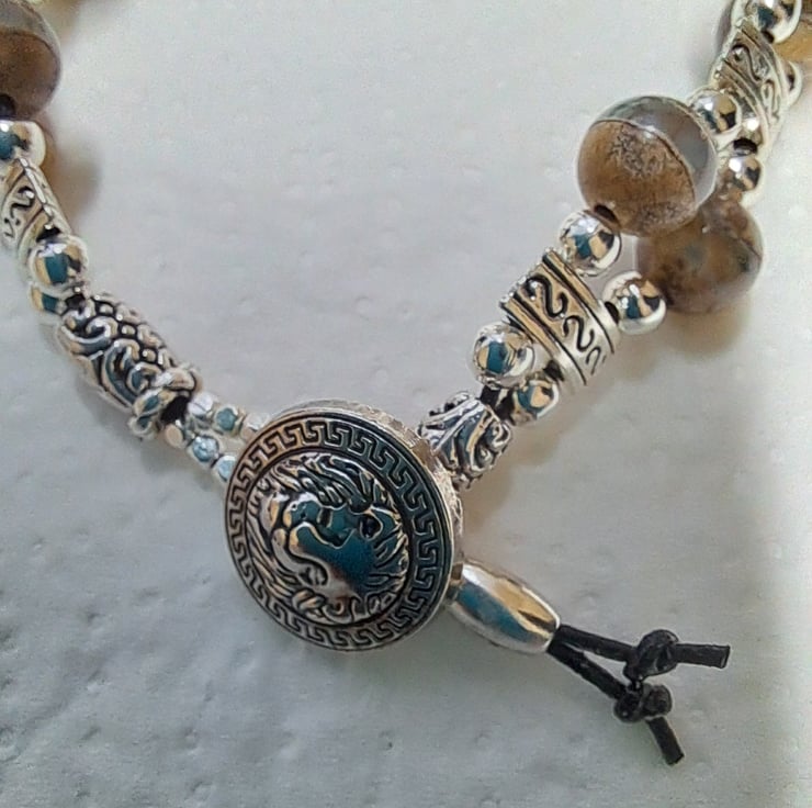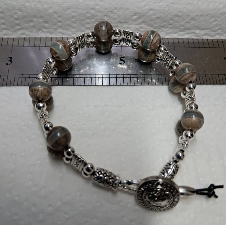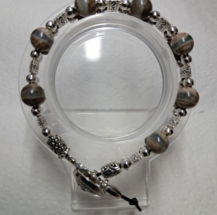 Beaded Leather Bracelet with 8mm Natural Grey Agate beads very unusual with Natural stripe. Tibetan silver spacers, 4mm silvertone beads, and endings. Round silver Lion Head button fastener. All strung on double 1mm leather cord. Will fit up to 7" wrist. Thankyou for looking. Lori