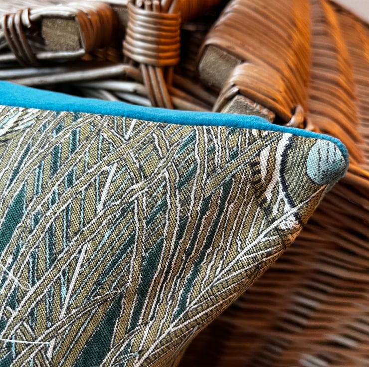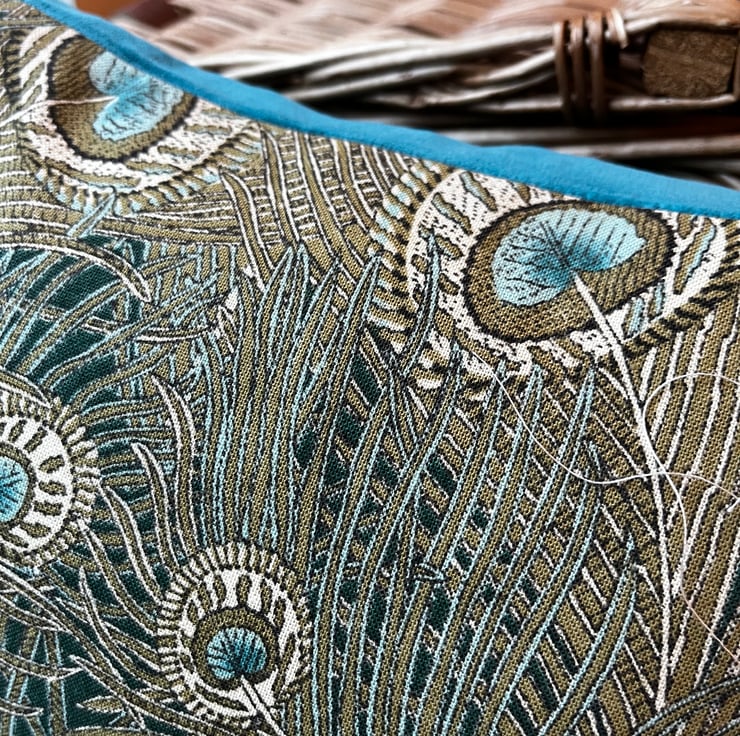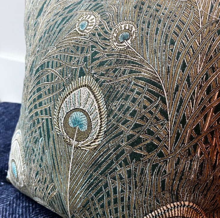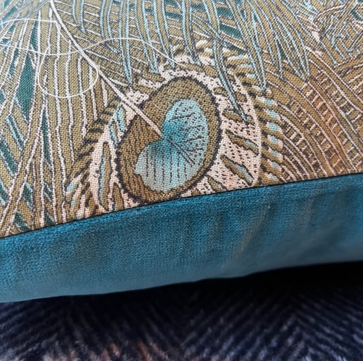 Beautiful peacock feather linen cushion cover made from Liberty Hera linen and backed with plain teal velvet which picks out the colour in the feathers.