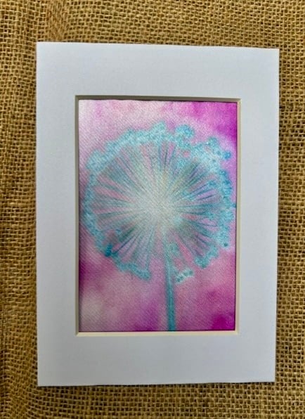 This beautiful , delicate allium has been hand printed onto silky material using a heat press. The dried flower is painted with special ink dye and pressed between pre-dyed special art paper in the heat press to create the unusual, etheral colours. The allium was picked from my garden and dried. The picture is in a white frame mount which measures 5" x 7" and is ready to frame in the frame of your choice.