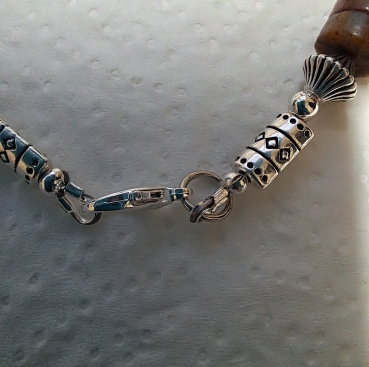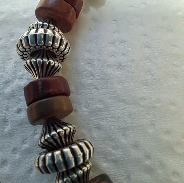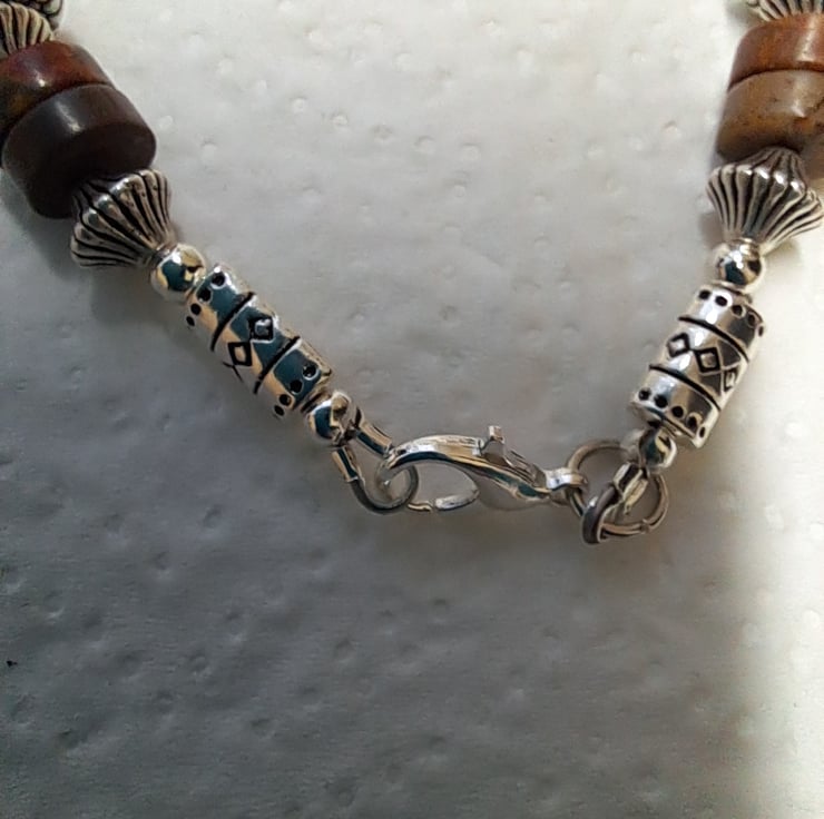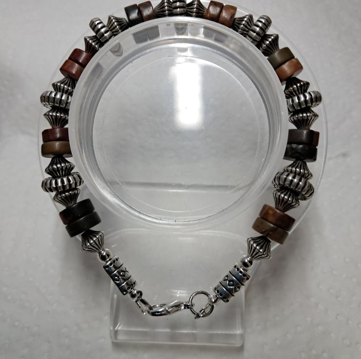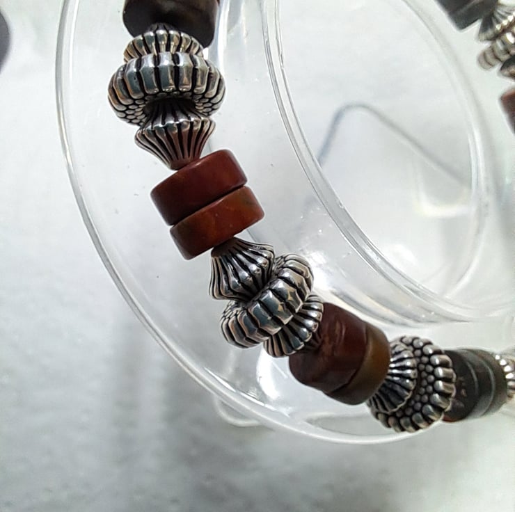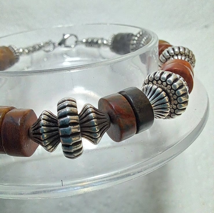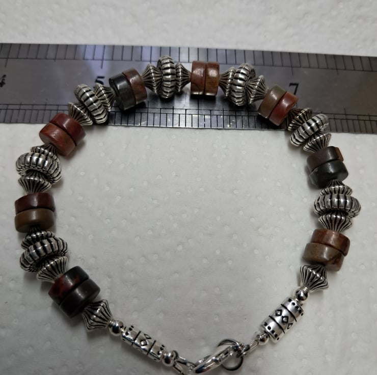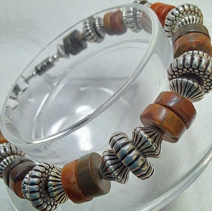 Beaded Bracelet on wire with 8mm x 3mm Natural Picasso Jasper round Rondelle mixed colour beads, with Gear bead spacers, Tibeten silver endings with Lobster Claw fastener. Handmade. Bohemian style. Will fit up to 7" wrist. Unisex. Thankyou for looking. Lori