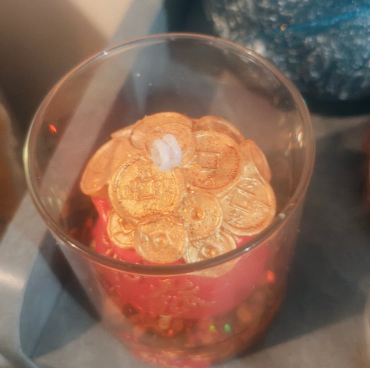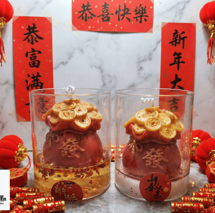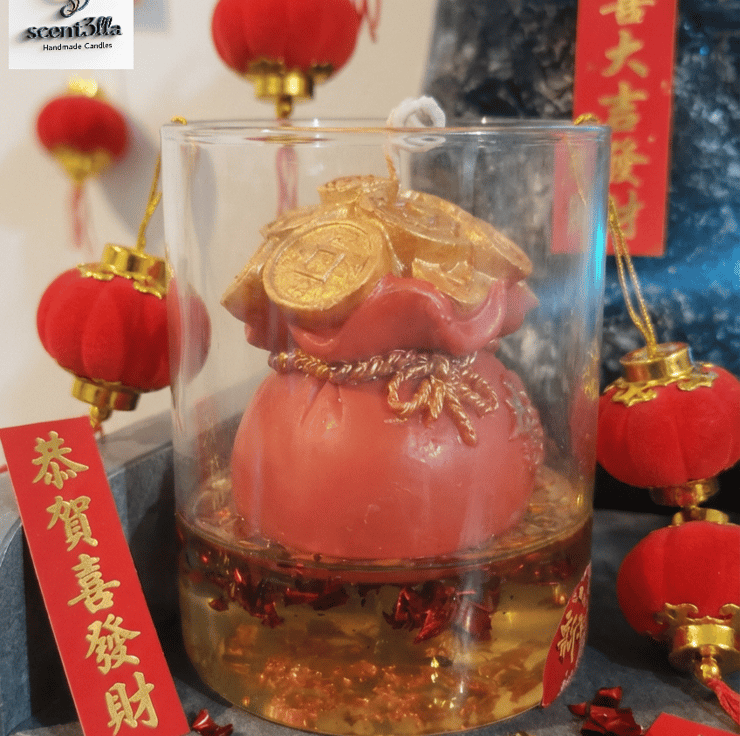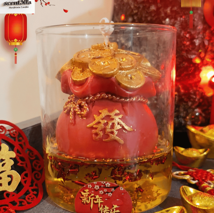 This exquisite handmade candle from scent3lla features a striking red fortune pouch design emblazoned with the golden character " Fa" (meaning "prosperity" and "wealth"), topped with gleaming gold coins. Encased in a clear glass container with a shimmering golden base, it’s adorned with festive red and gold accents that embody traditional Lunar New Year symbolism.