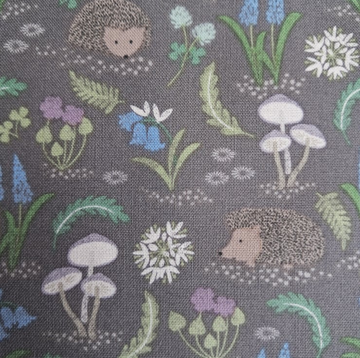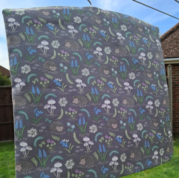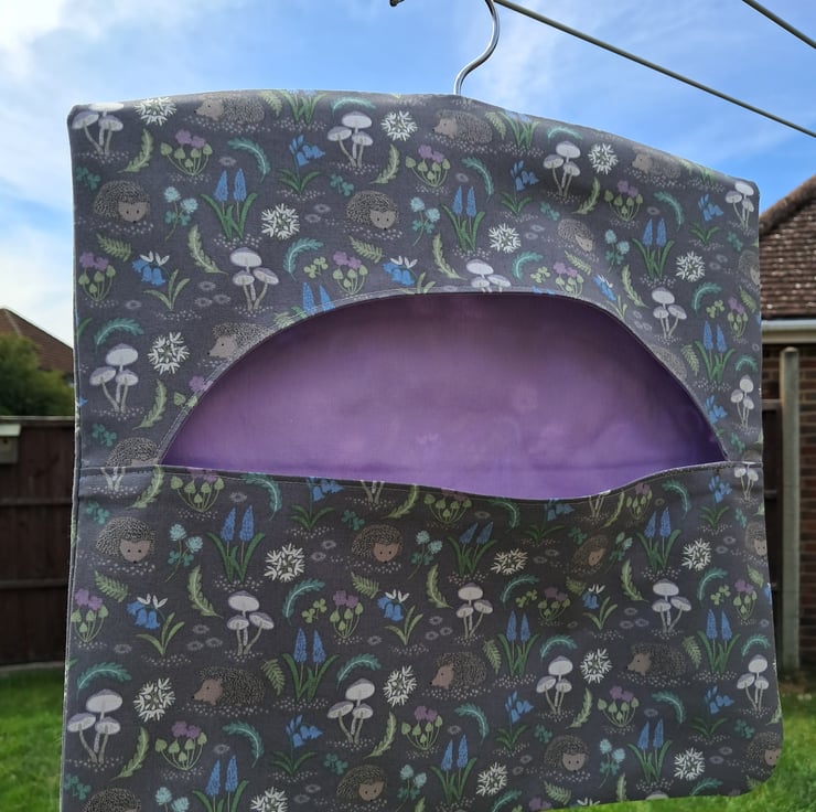 100% cotton peg bag with wooden coat hanger. This design has a nice large opening for getting to your pegs, as well as plenty of peg storage space. The wooden coat hanger used has a metal hook which can be turned to face either direction. The fabric has beautiful hedgehogs throughout with lilac cotton lining on the inside.