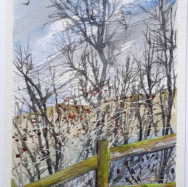 Inspired by a skeletal blackthorn hedge that I see every day, which has some remains of dried rosehips running through it.