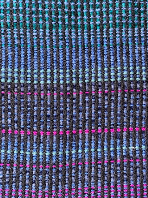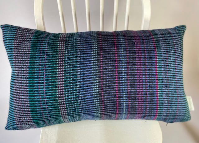 100% British wool cushion , complete with inner pad. Hand woven in blues, greens, pink and black.