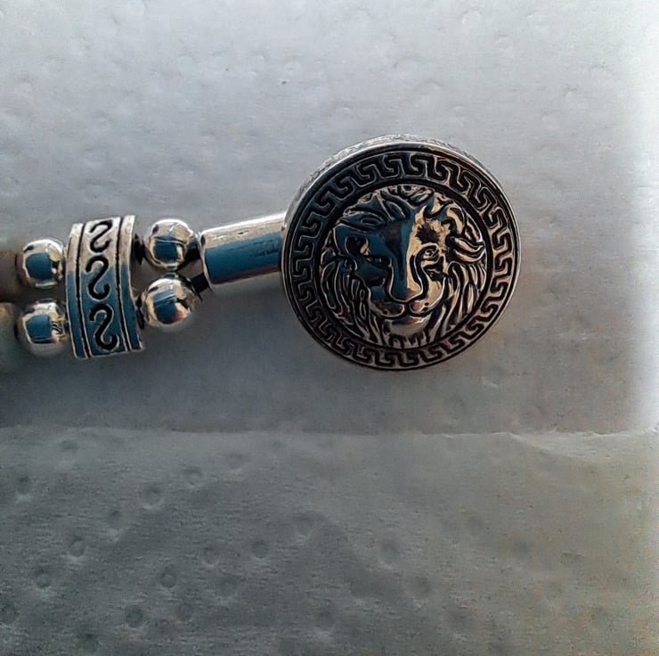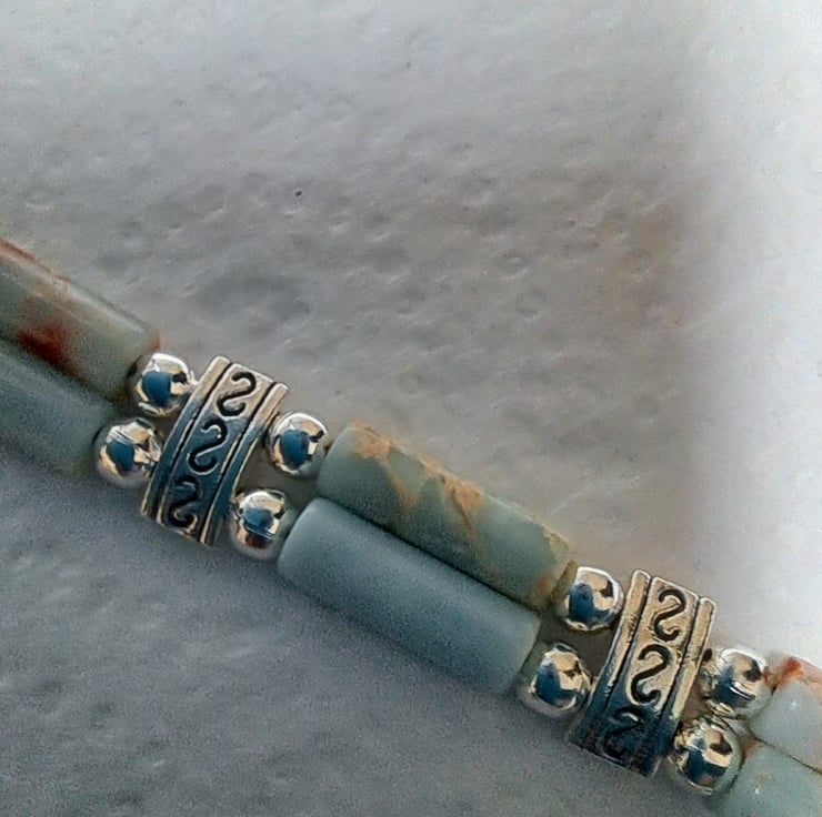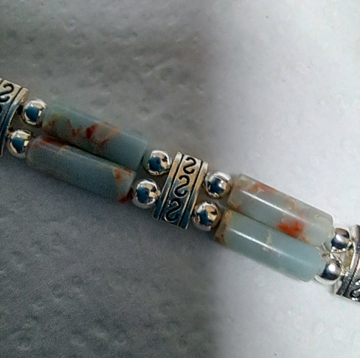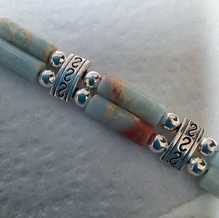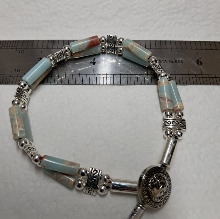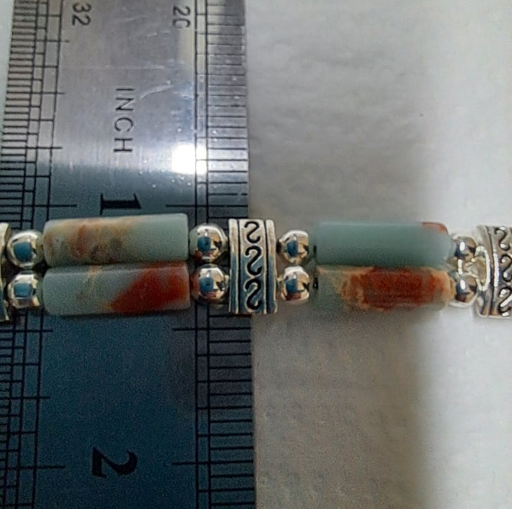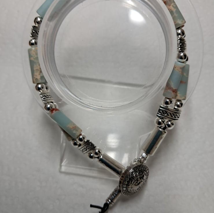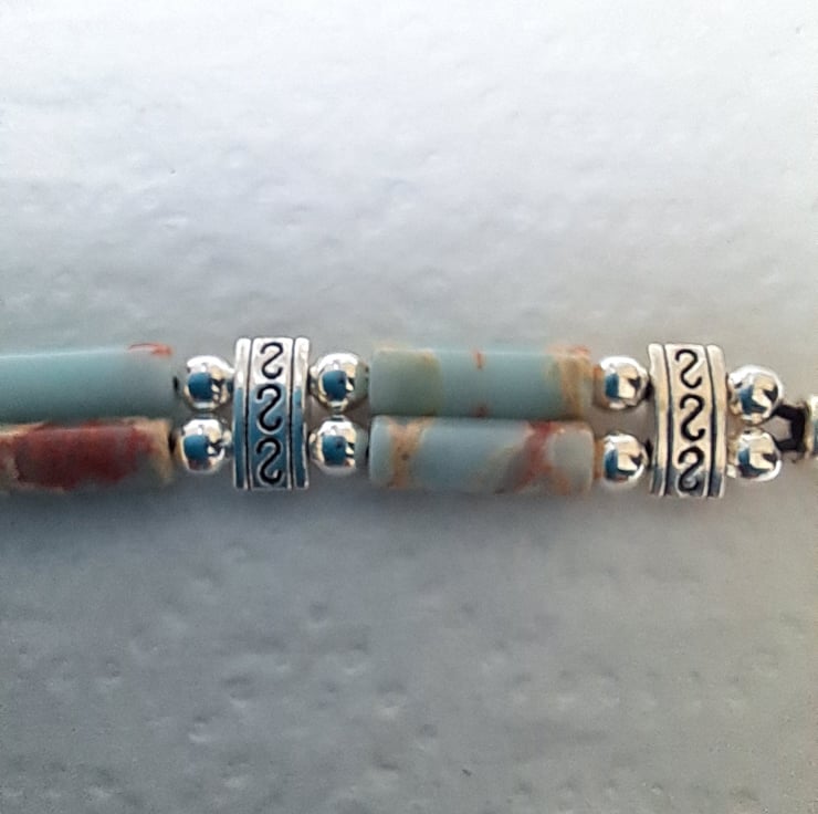 Leather Beaded Gate Bracelet with 4mm x 13mm Shoushan Jasper tube beads, gorgeous natural marble effect. Tibetan silver spacers and endings with 4mm silvertone beads. Lion Head button fastener . All strung on double 1mm leather cord. Handmade. Will fit up to 7.1/2" wrist.. Thankyou for looking. Lori