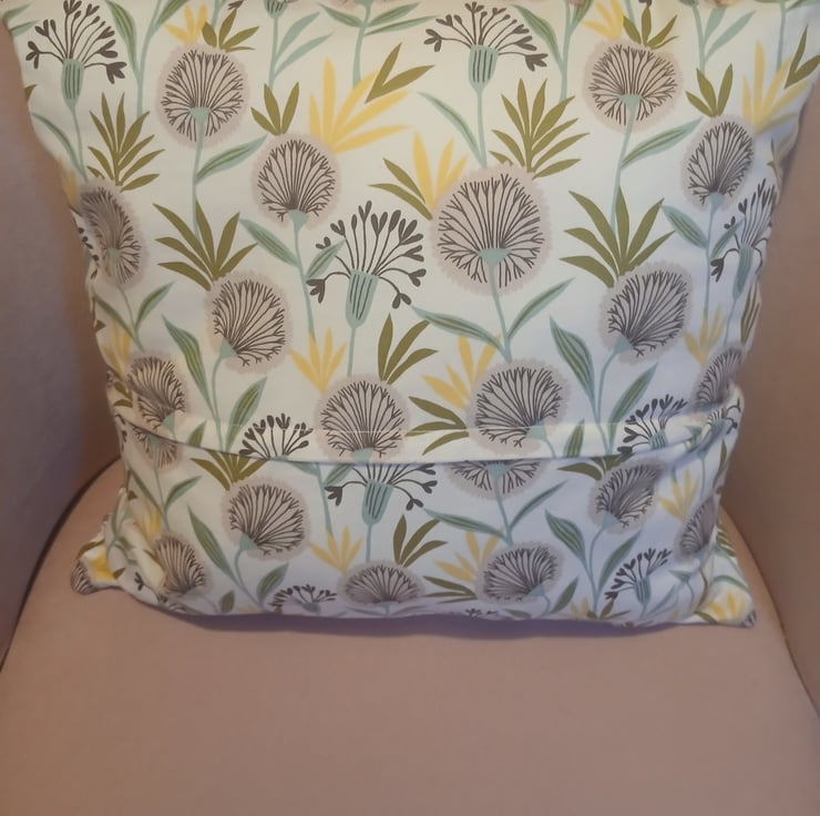 A 16-inch square cushion which has a baby white tiger appliqued onto floral cotton fabric . The cushion has a hidden zip at the back.