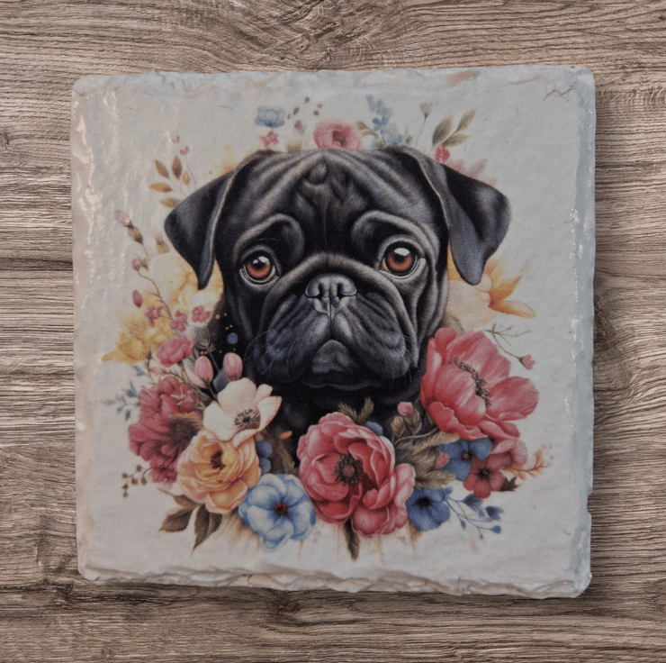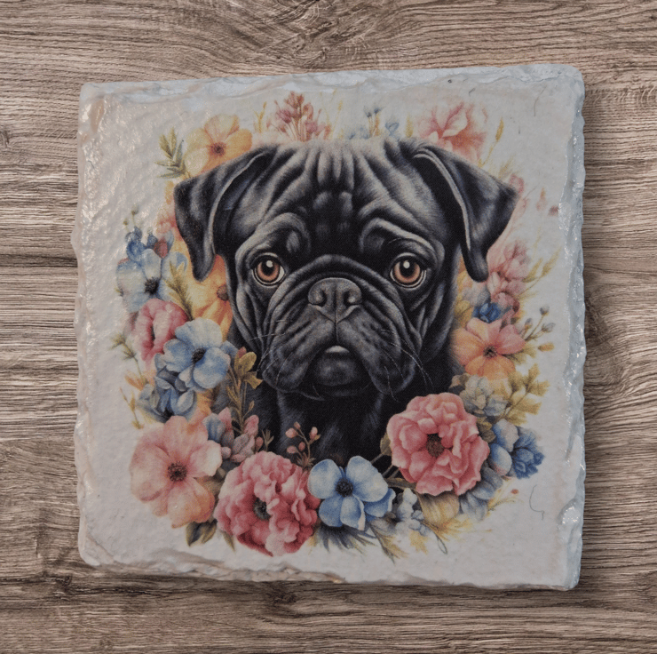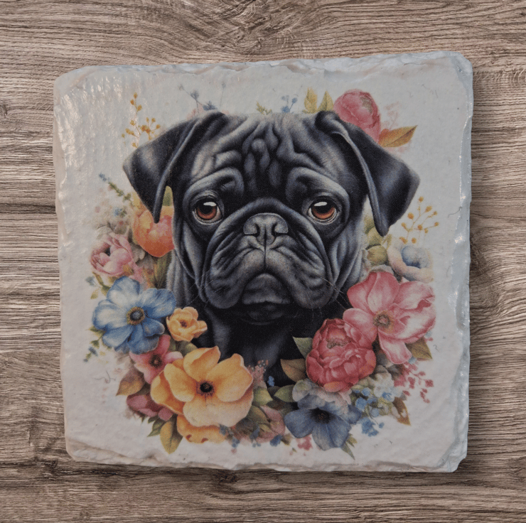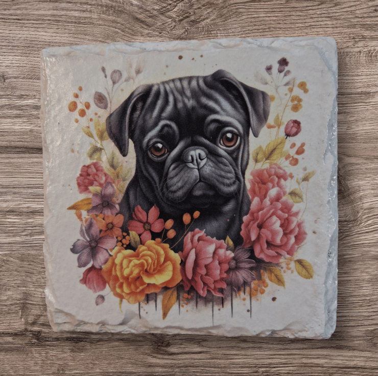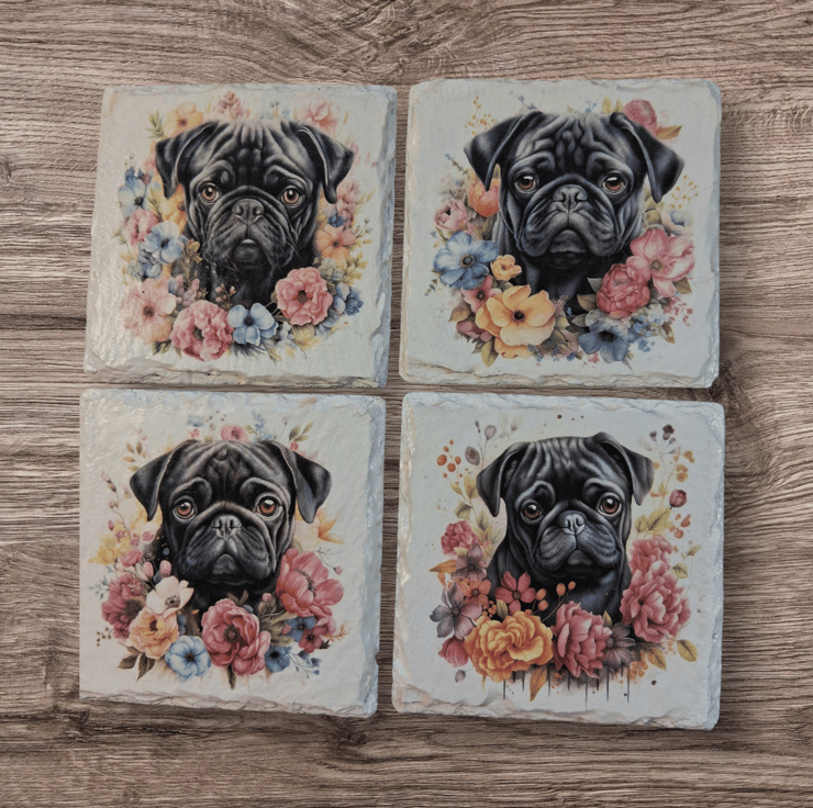 This 4 piece slate coaster set has been hand painted and decoupaged with a beautiful Black Pug Dog.